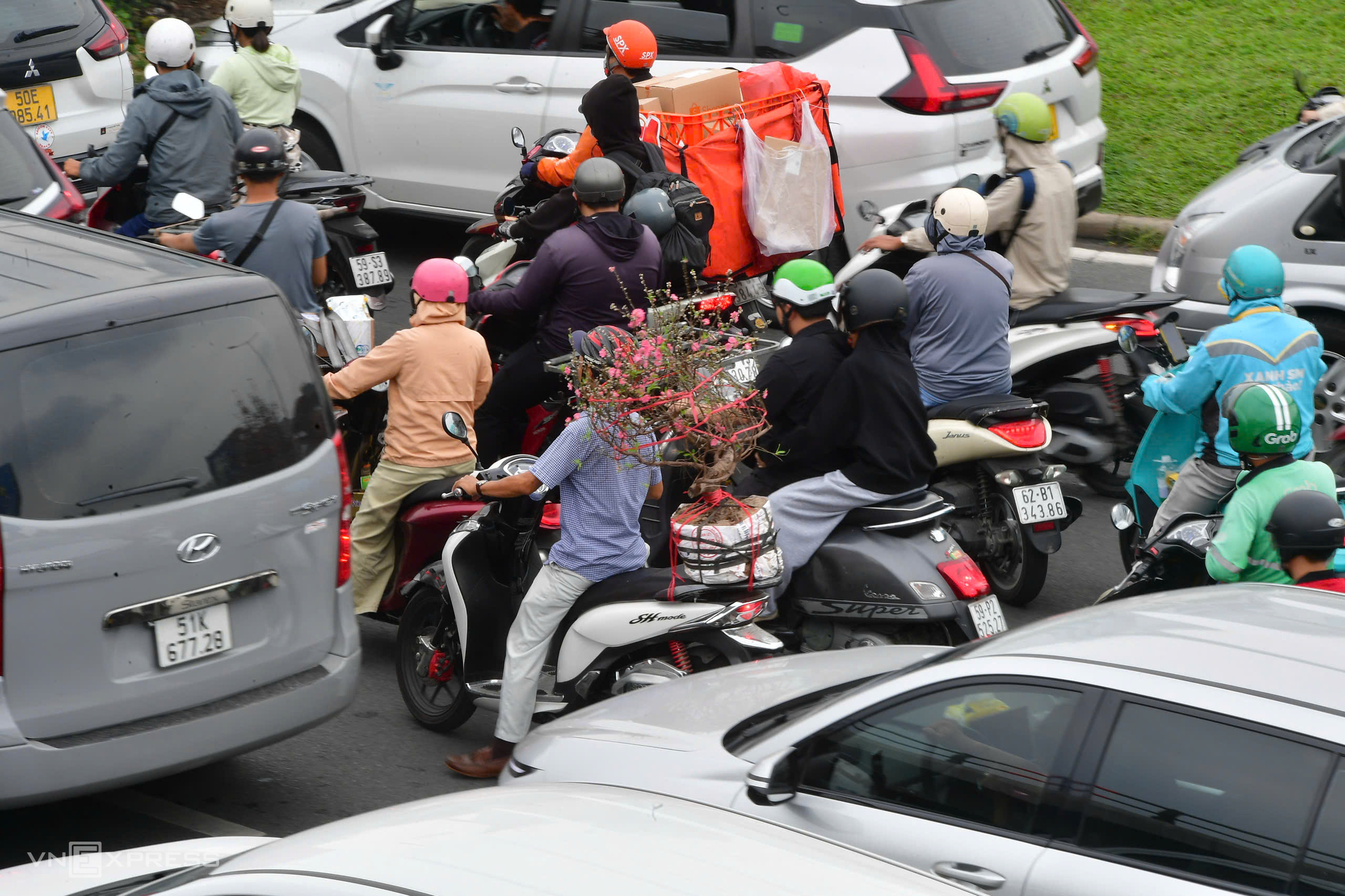 People carrying Tet peach blossoms jostled through the congested road section.