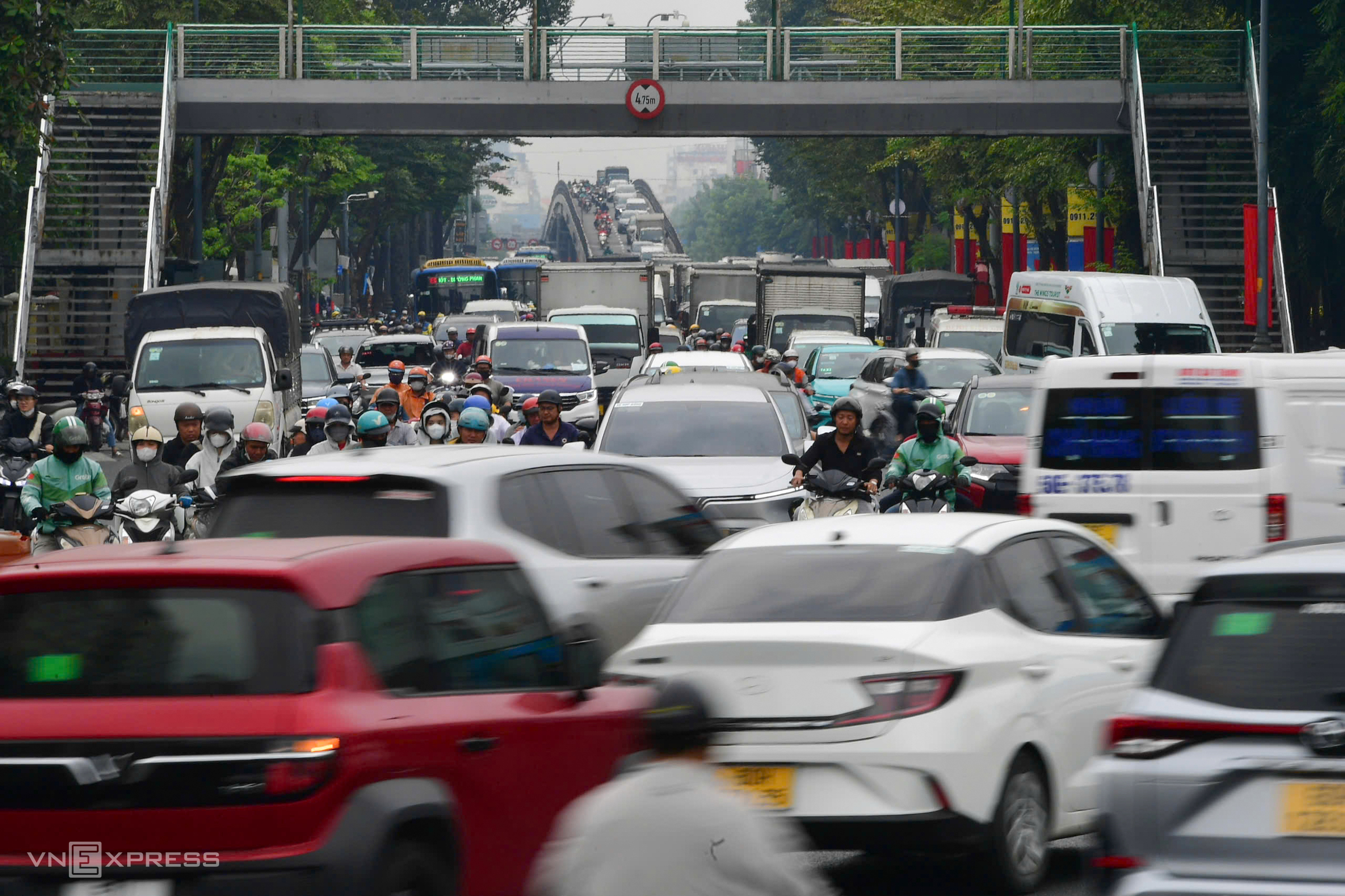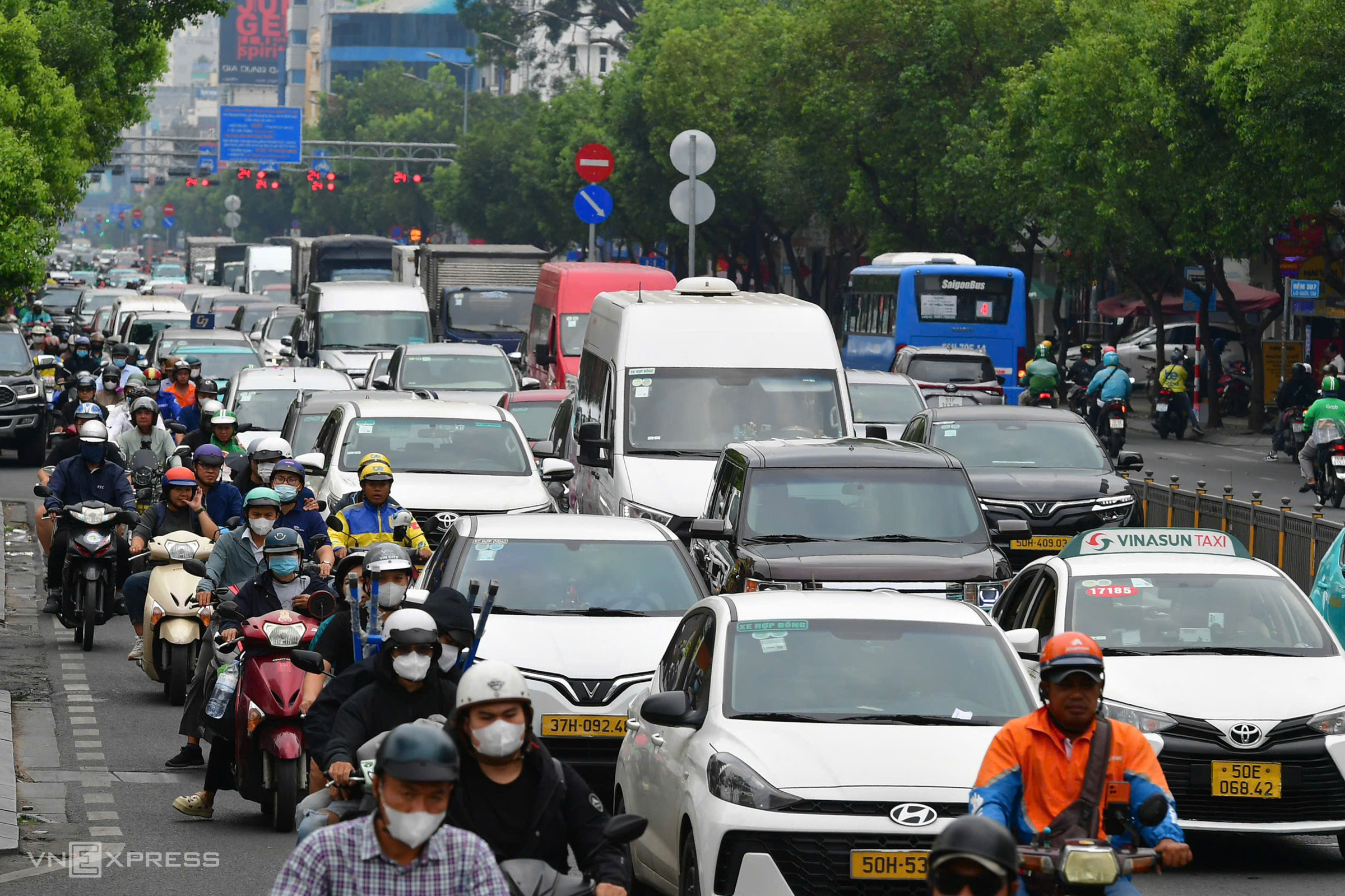 Vehicles inched forward on Truong Son street, heading from the airport towards the city center.