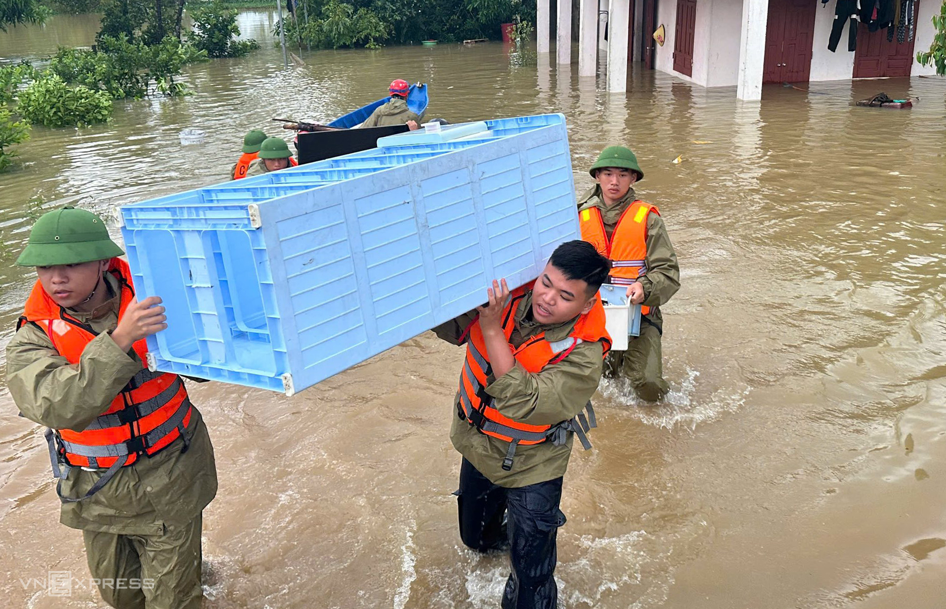 While official figures are unavailable, dozens of communes and wards in Thanh Hoa, including Cam Thuy, Ba Thuoc, Vinh Loc, Nga Son, and Ham Rong, are currently flooded after Typhoon Kajiki. In the photo, police evacuate property for residents of Ba Dinh commune on the morning of 27/8. |