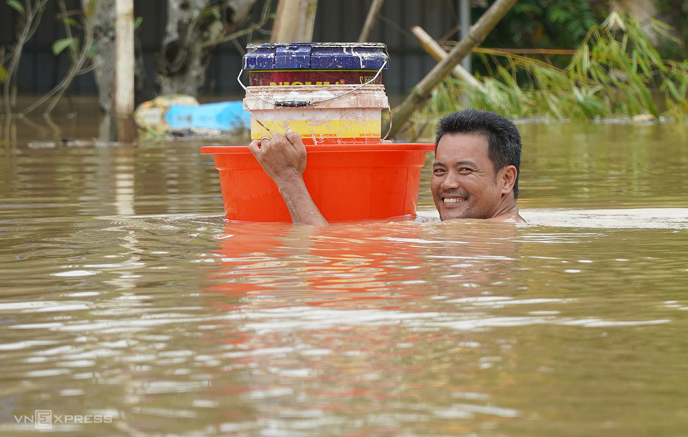 Luong Trong Truong, from neighborhood 7, Ham Rong ward, swam through the floodwaters to retrieve food supplied by relatives. His house is currently flooded to a depth of over one meter. "The floodwaters rose very quickly. I stayed up all night and early this morning to move belongings to higher ground to prevent damage," Truong said, adding that the Ma River's water level is only 20-30 cm below the historic flood peak of 2017.