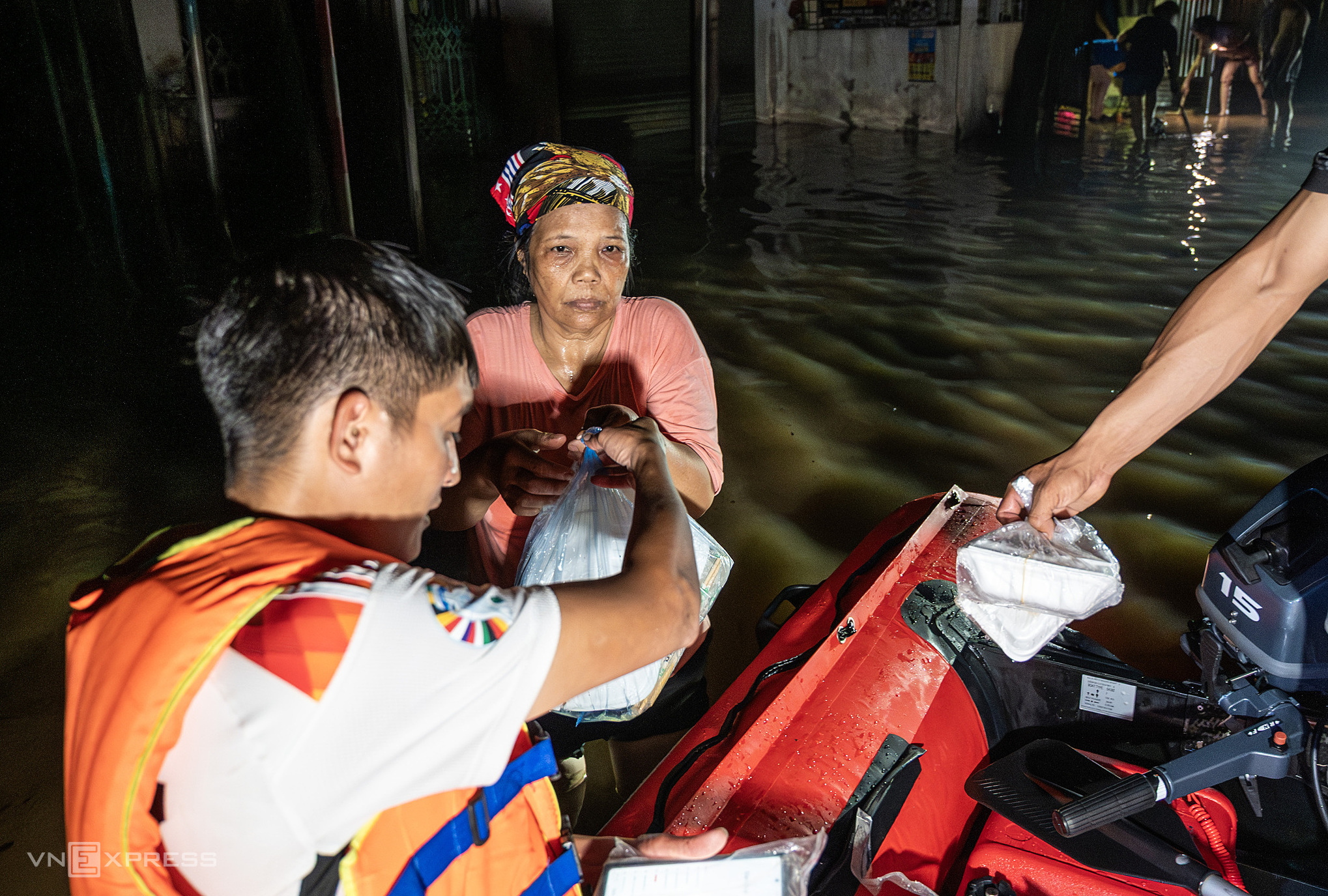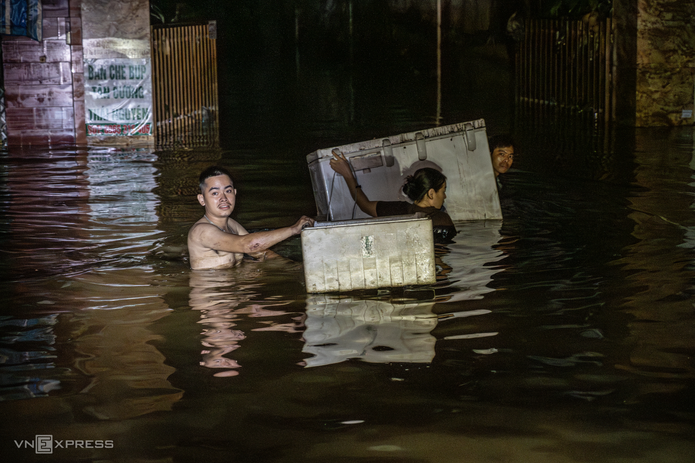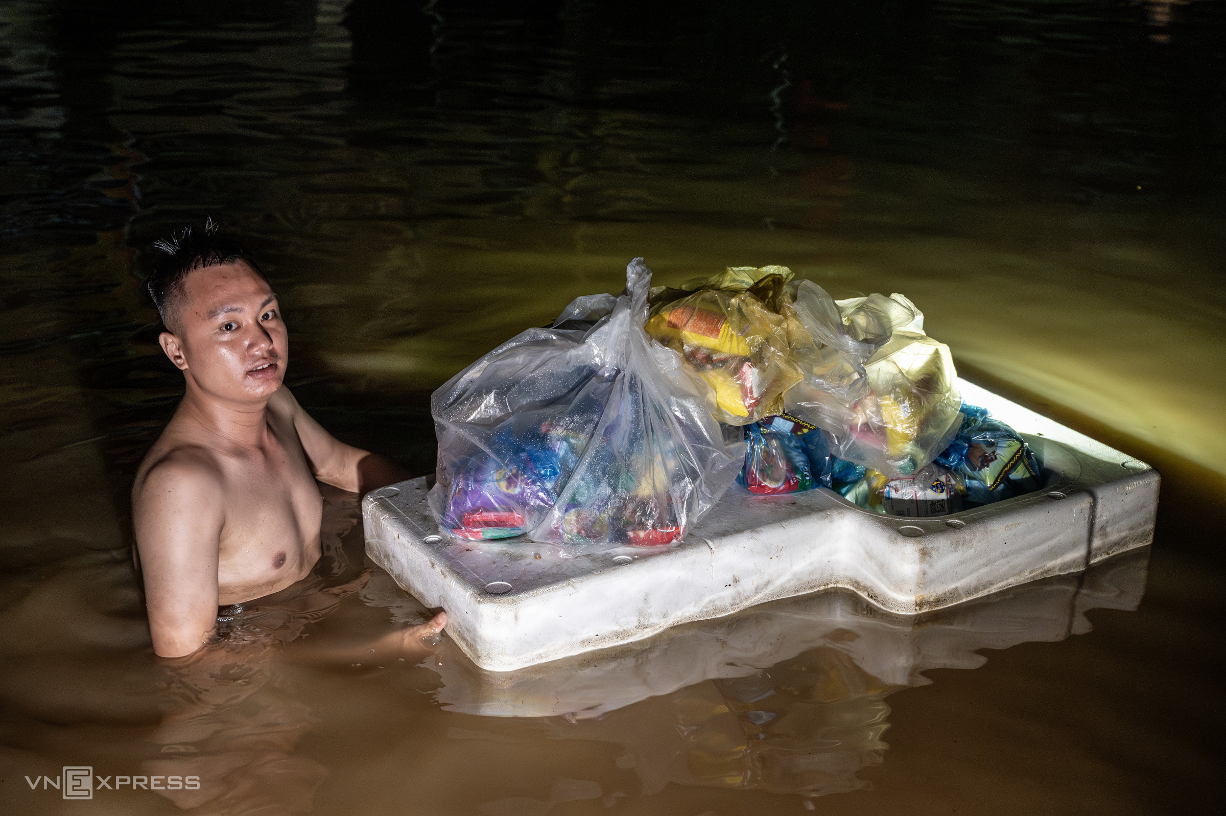 With floodwaters chest-deep, Nguyen The Son used a styrofoam box to transport relief supplies. "My house currently hosts 20 people, all neighbors and relatives gathered at the highest point," Son shared.