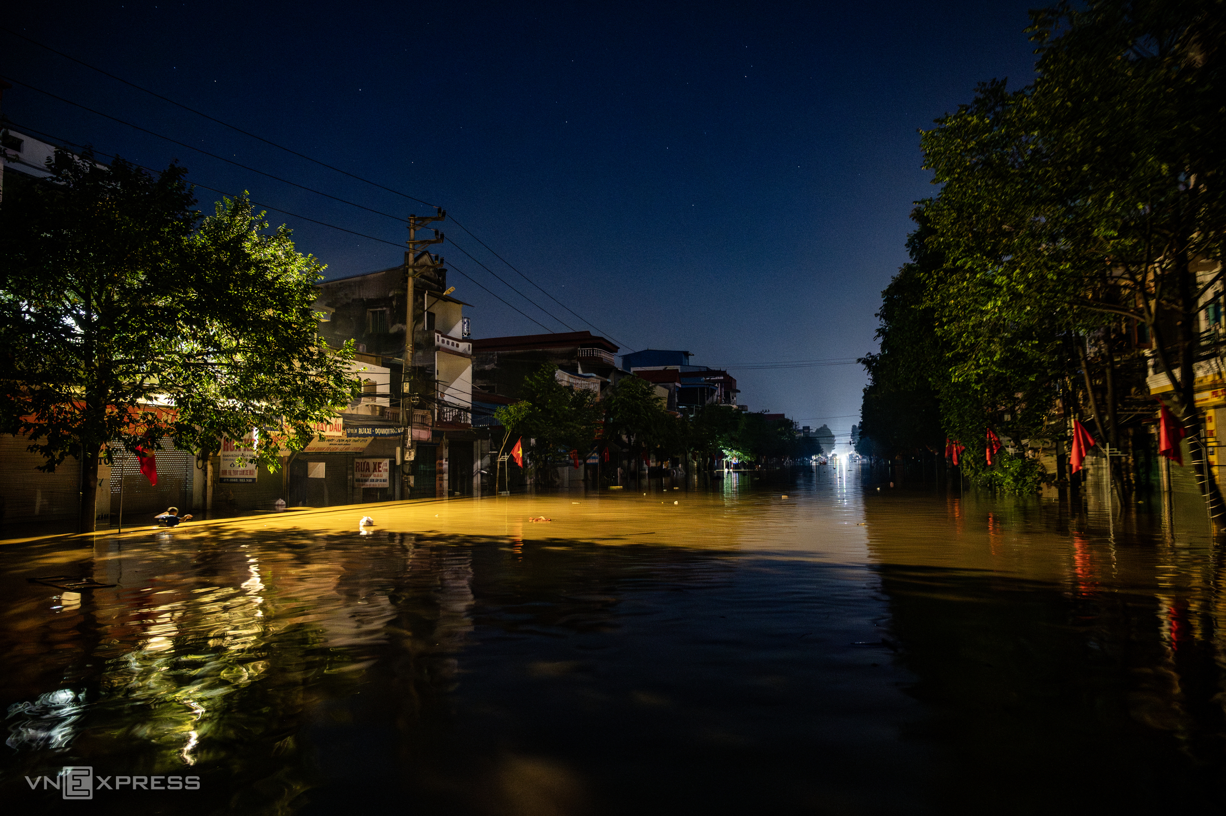 On the night of 8/10, Thai Nguyen city center remained deeply submerged, with some areas under 3 meters of water. Duong Tu Minh street in Quang Vinh ward transformed into a river, almost completely isolated. For three days, residents there have relied on relief supplies due to power and water loss, forcing them to move to higher floors or seek shelter with relatives.