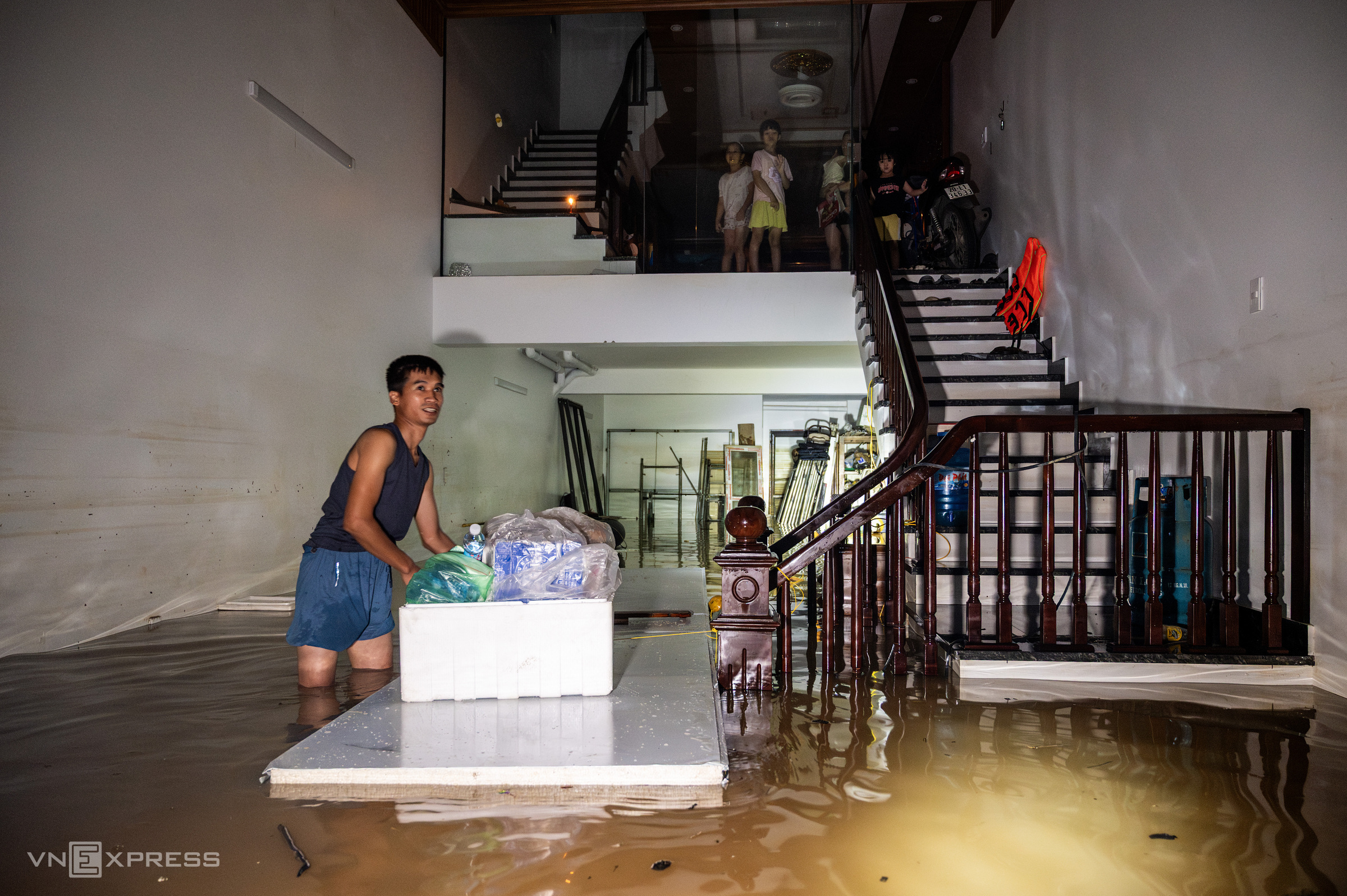Nguyen Dinh Luan carried supplies into his knee-deep flooded house on Duong Tu Minh street. "The floodwaters have receded by half, but the damage to my three workshops is nearly one billion VND. We can only try to rebuild, because the water rose too quickly for us to evacuate in time," Luan explained.