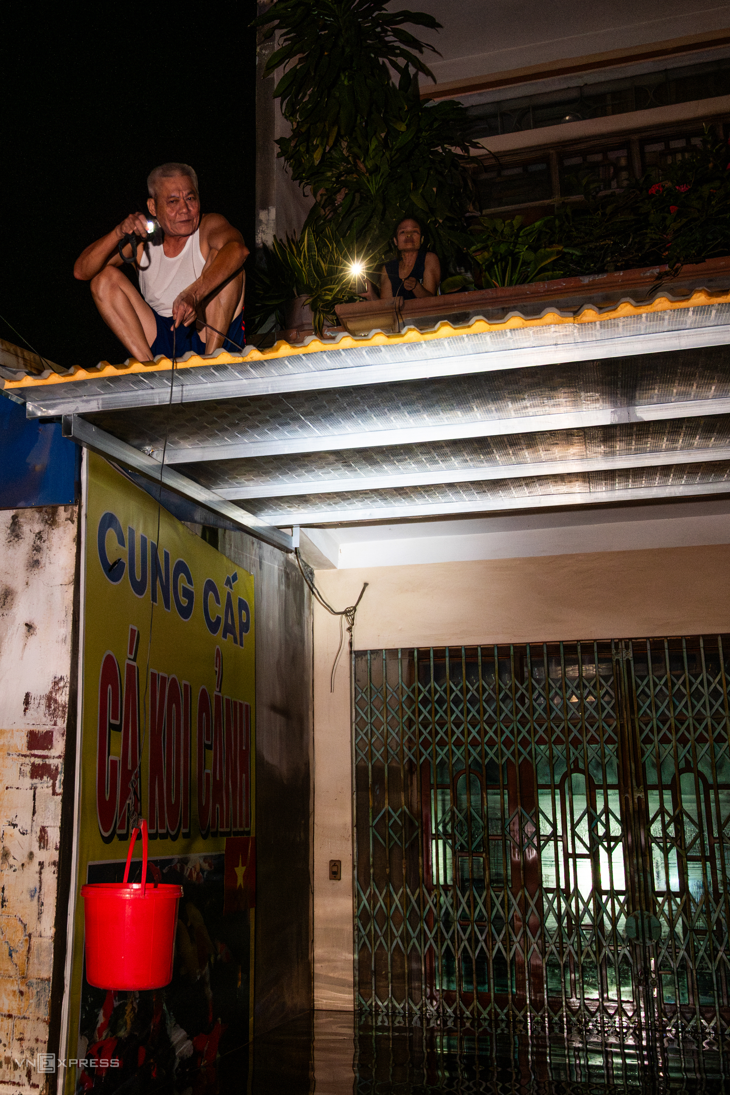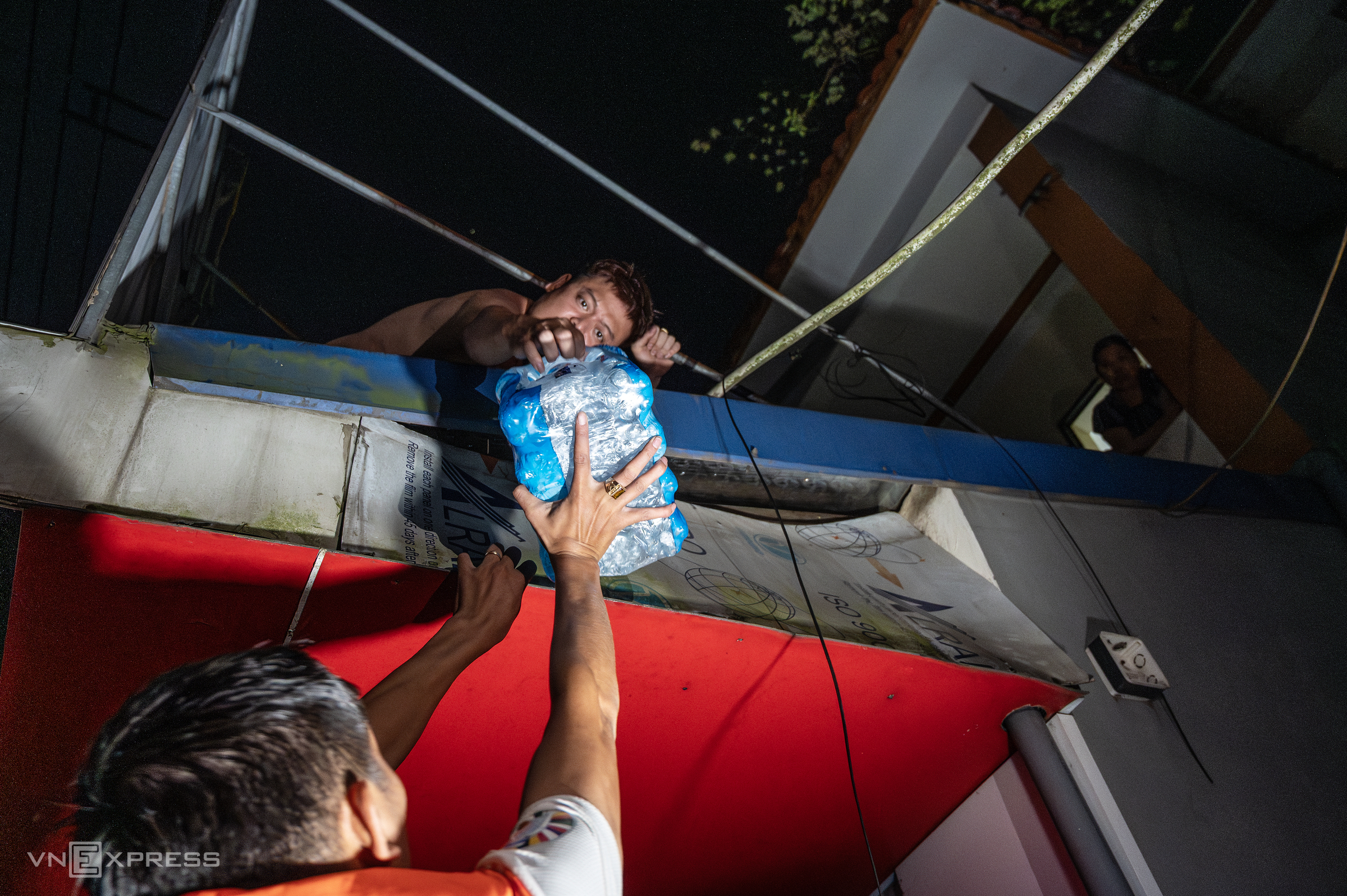 Sitting on the second floor, Mr. and Mrs. Ky prepared a plastic bucket as a makeshift pulley, awaiting a relief boat at night. Ky stated that for three days, floodwaters submerged their entire first floor, and with no electricity or water, they could not cook.