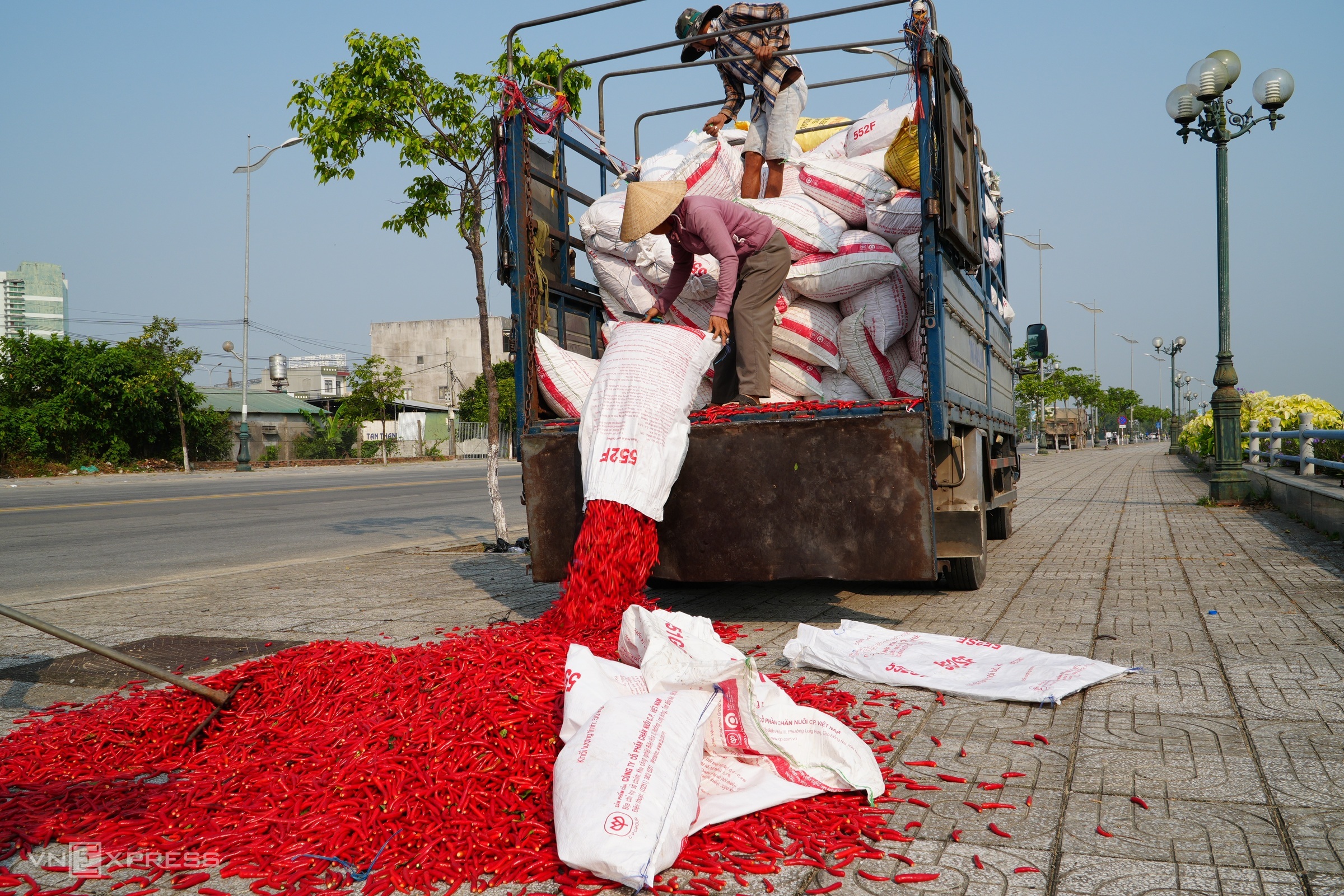 Each morning, small trucks transport fresh chili to the sidewalks of Truong Sa road for drying. While fresh chili is primarily exported unofficially to Trung Quoc, this year's reduced demand and increased transportation costs have driven prices down to 5,000-7,000 VND per kg. Consequently, farmers are drying significantly more chili than in previous years.
