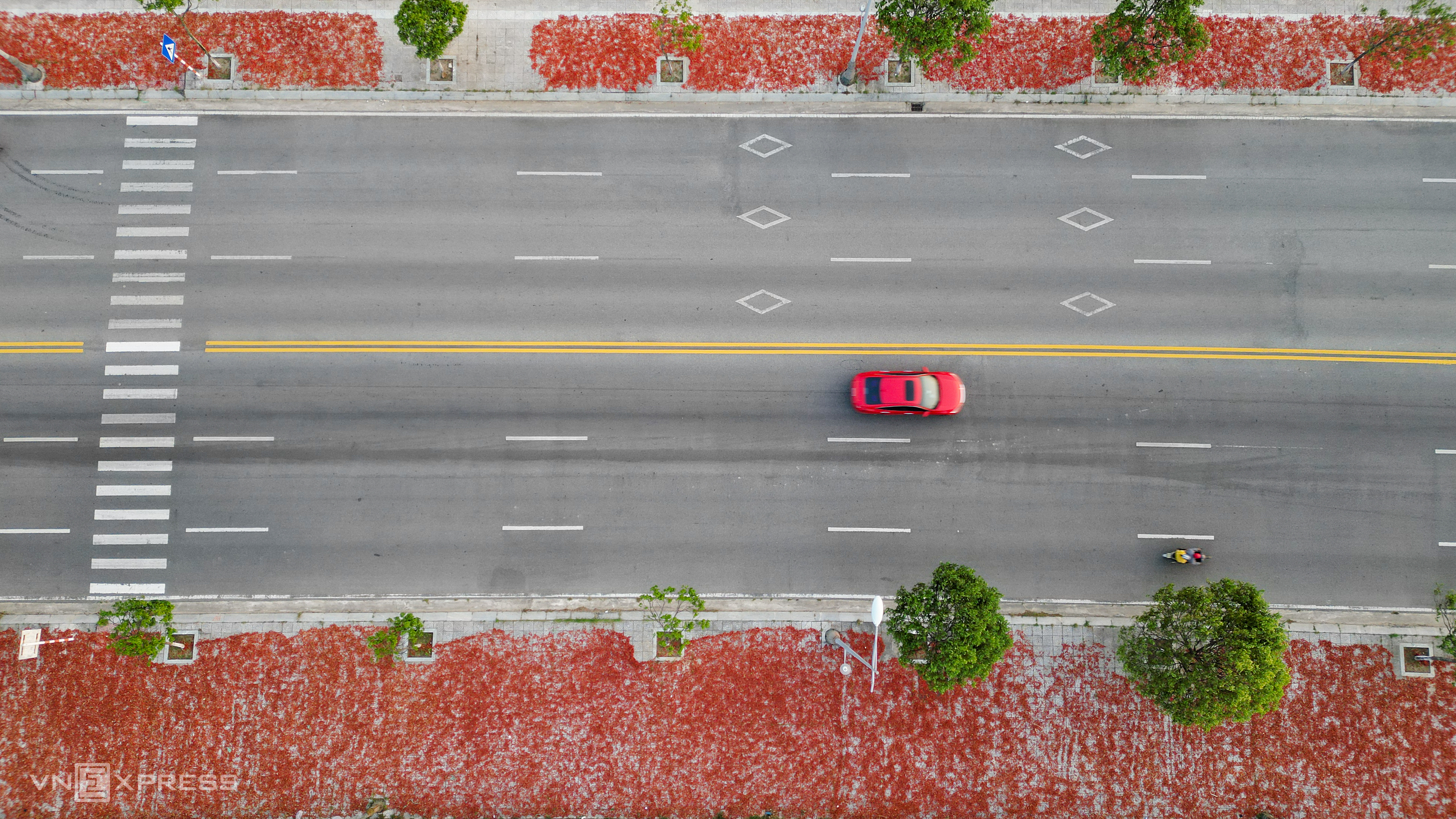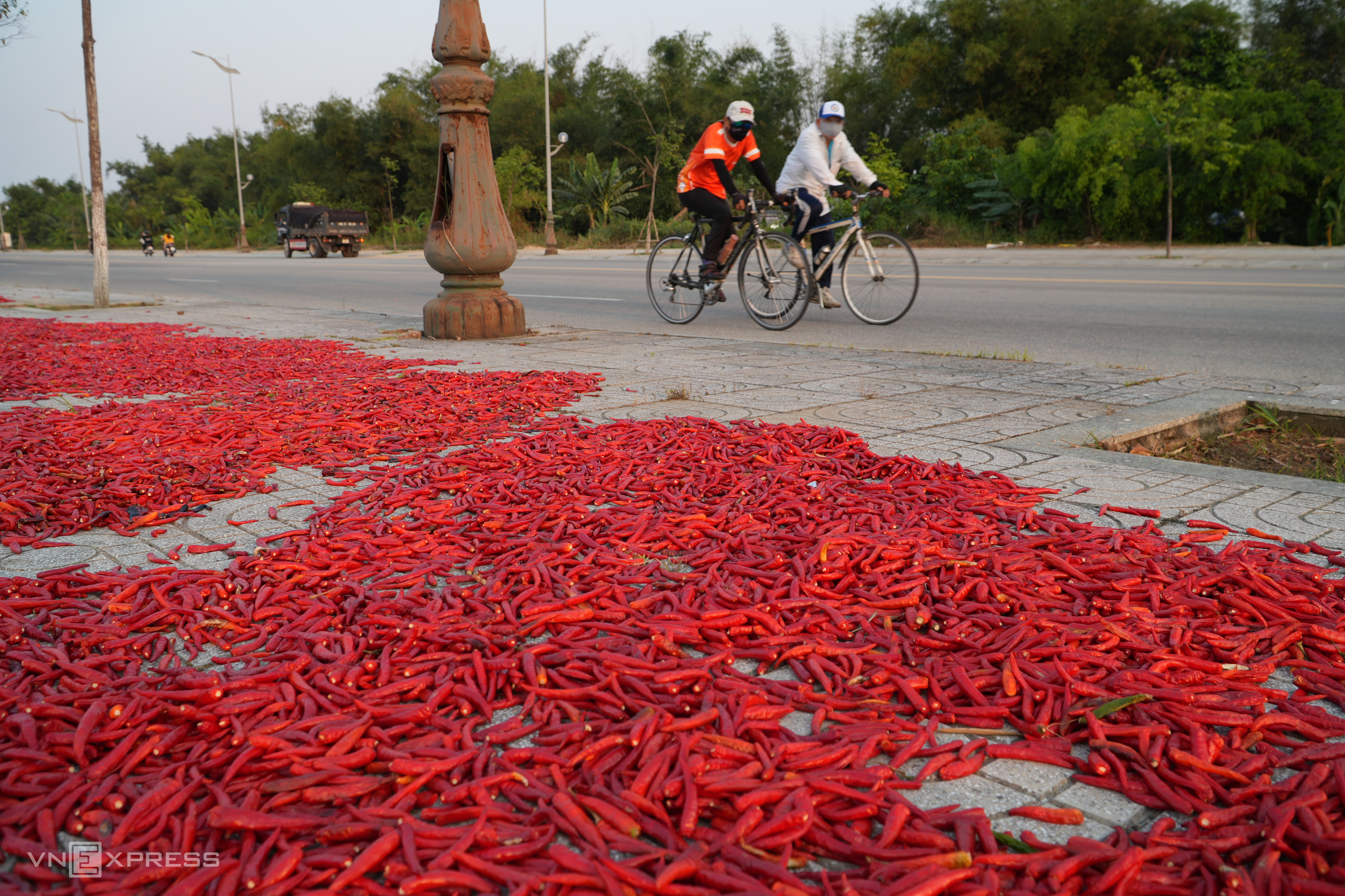 Truong Sa road, running alongside Tra Khuc river in Quang Ngai, features a 22 m wide carriageway. With sparse traffic, drying chili on the sidewalks has minimal impact on vehicle movement.