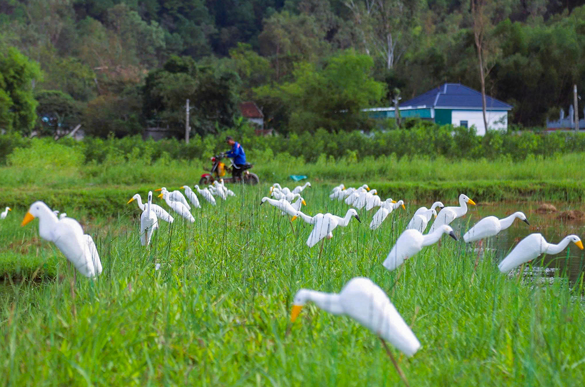 In mid-September, the fields of Tan Chau, Hai Chau, Duc Chau, An Chau, Minh Chau, and Hung Chau, formerly part of Dien Chau district, were dotted with a startling sight: thousands of fake herons, egrets, and pond herons. These lifelike decoys, made of painted styrofoam, were planted close together among the rice paddies, alongside bamboo poles coated with strong adhesive. Hunters also use live birds with their eyes sewn shut or loudspeakers playing bird calls to lure their prey. Any bird landing near the decoys becomes instantly trapped, struggling only to become more entangled.