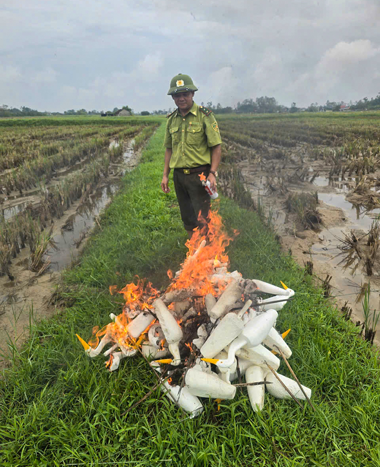 Dien Chau Forest Protection Department officers destroy fake birds in the fields in mid-September. Photo: Hung Le