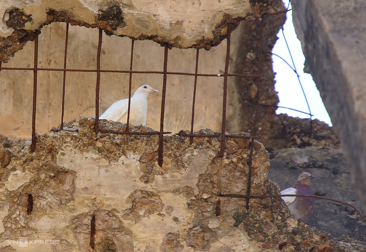 The concrete ceiling, pierced by bombs and shells, now provides shelter for birds.