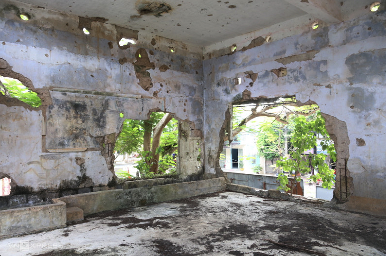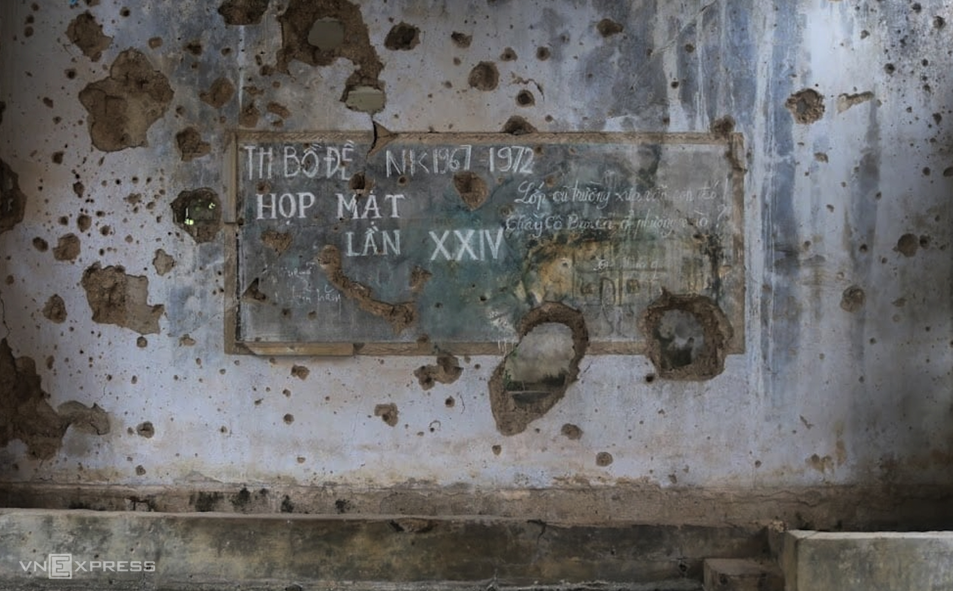 A classroom wall is riddled with bullet holes. The school stands as a testament to the ferocity of the war against the US in general, and the battle to defend the Quang Tri Citadel in particular.