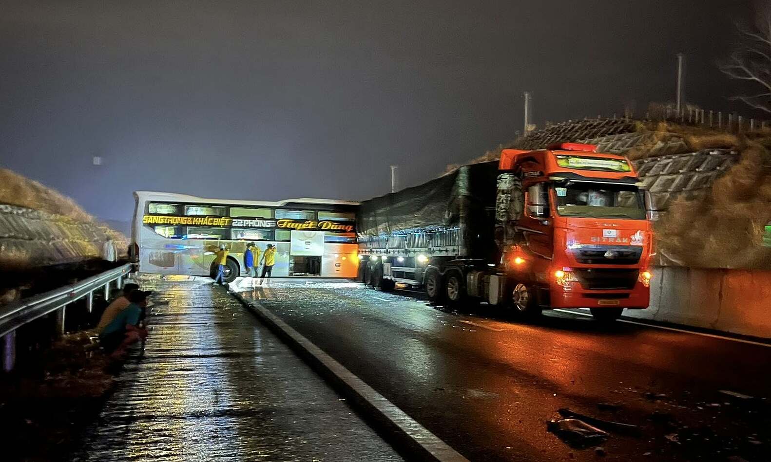Around 3h, on the Dau Giay – Phan Thiet expressway near Tan Lap commune, an old passenger bus with a Binh Dinh license plate unexpectedly collided with the rigid median barrier, knocking down 7 concrete sections. It then slid into the shoulder, damaging the guardrail.