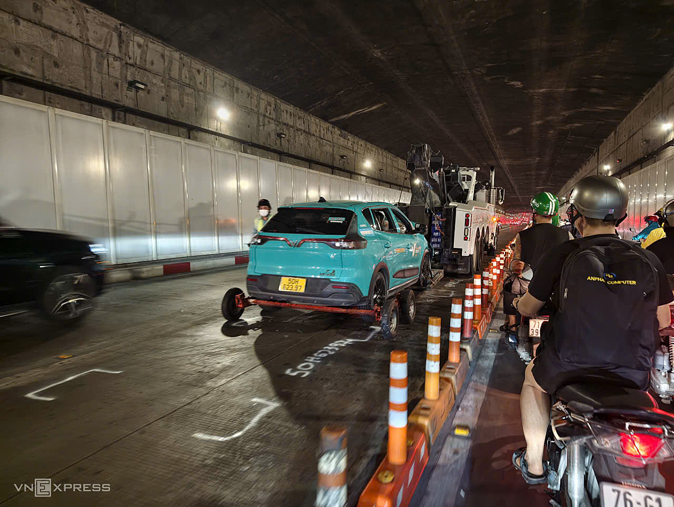 The accident resulted in no injuries and only minor damage to the vehicles. However, the cars blocked a lane, causing prolonged congestion on Vo Van Kiet Boulevard leading into the tunnel. The situation worsened during rush hour, with vehicles continuously piling up and creating a jam stretching nearly 1 km. Cars and motorbikes covered the road, moving inch by inch.