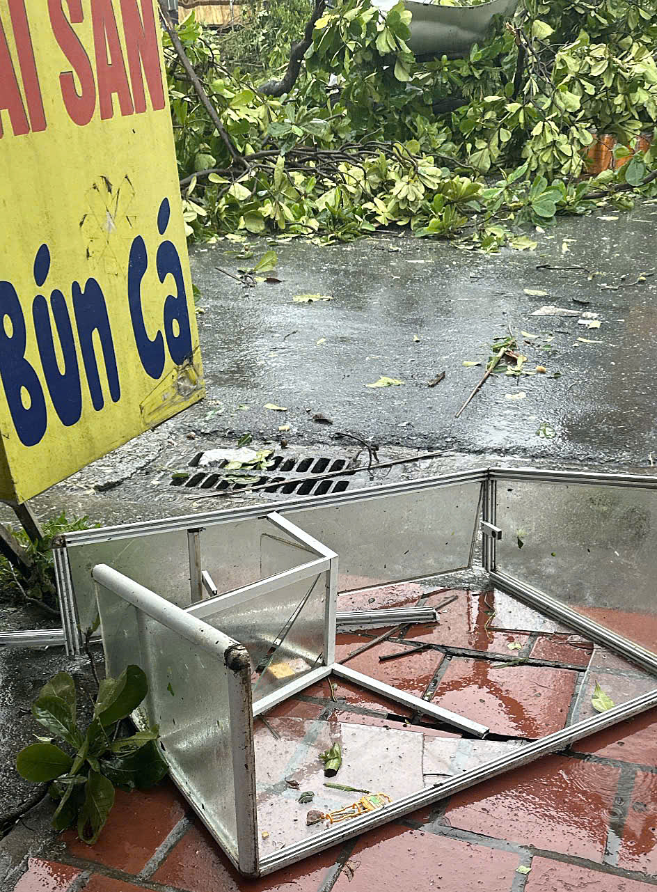 "The gust lasted about two minutes, damaging many shops along a 100-meter stretch of Road 23B. Some businesses had their signs ripped off, while others had their dish cabinets blown over. A parked car had its windshield smashed by a flying tree branch," Linh recounted.