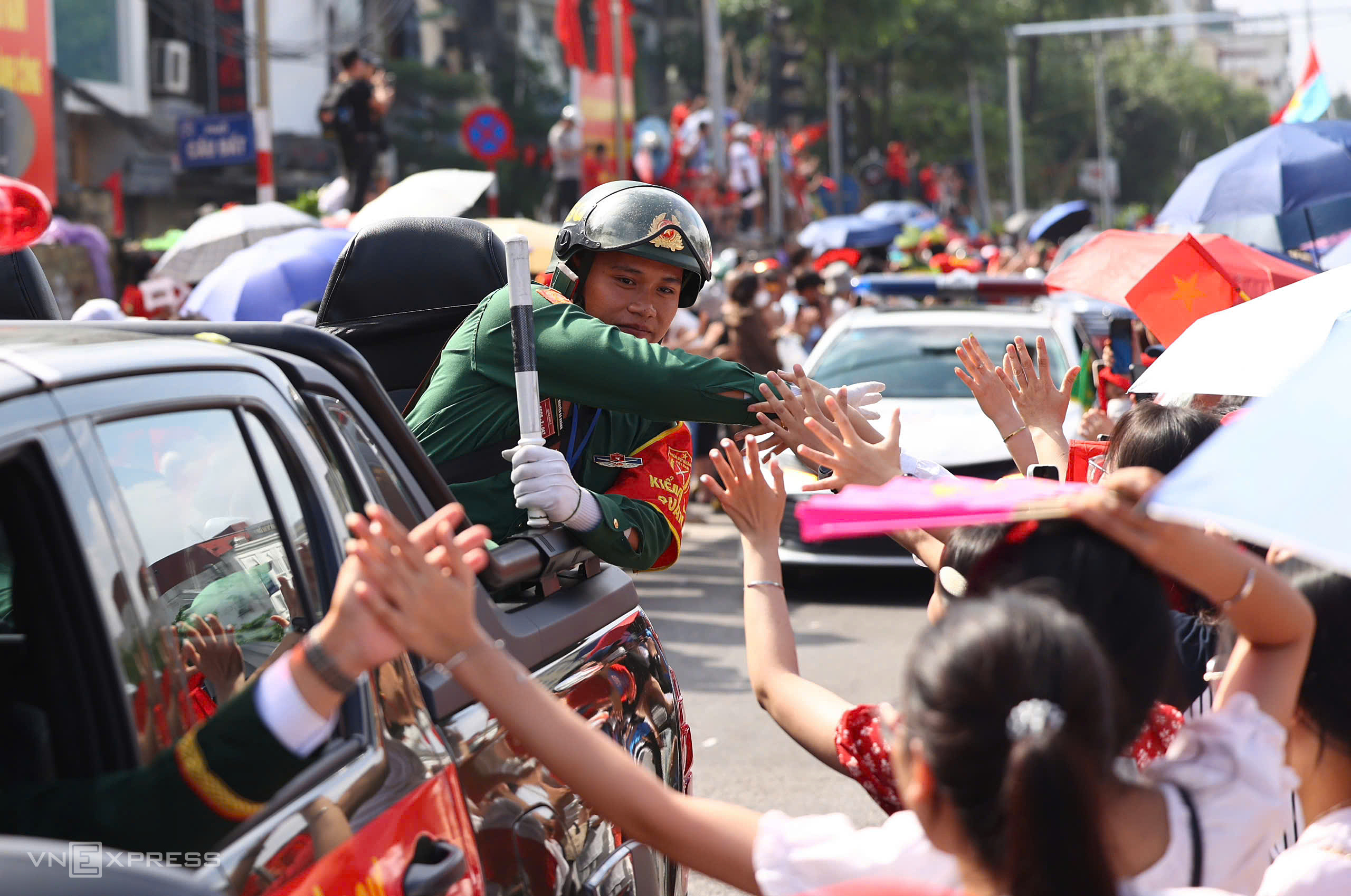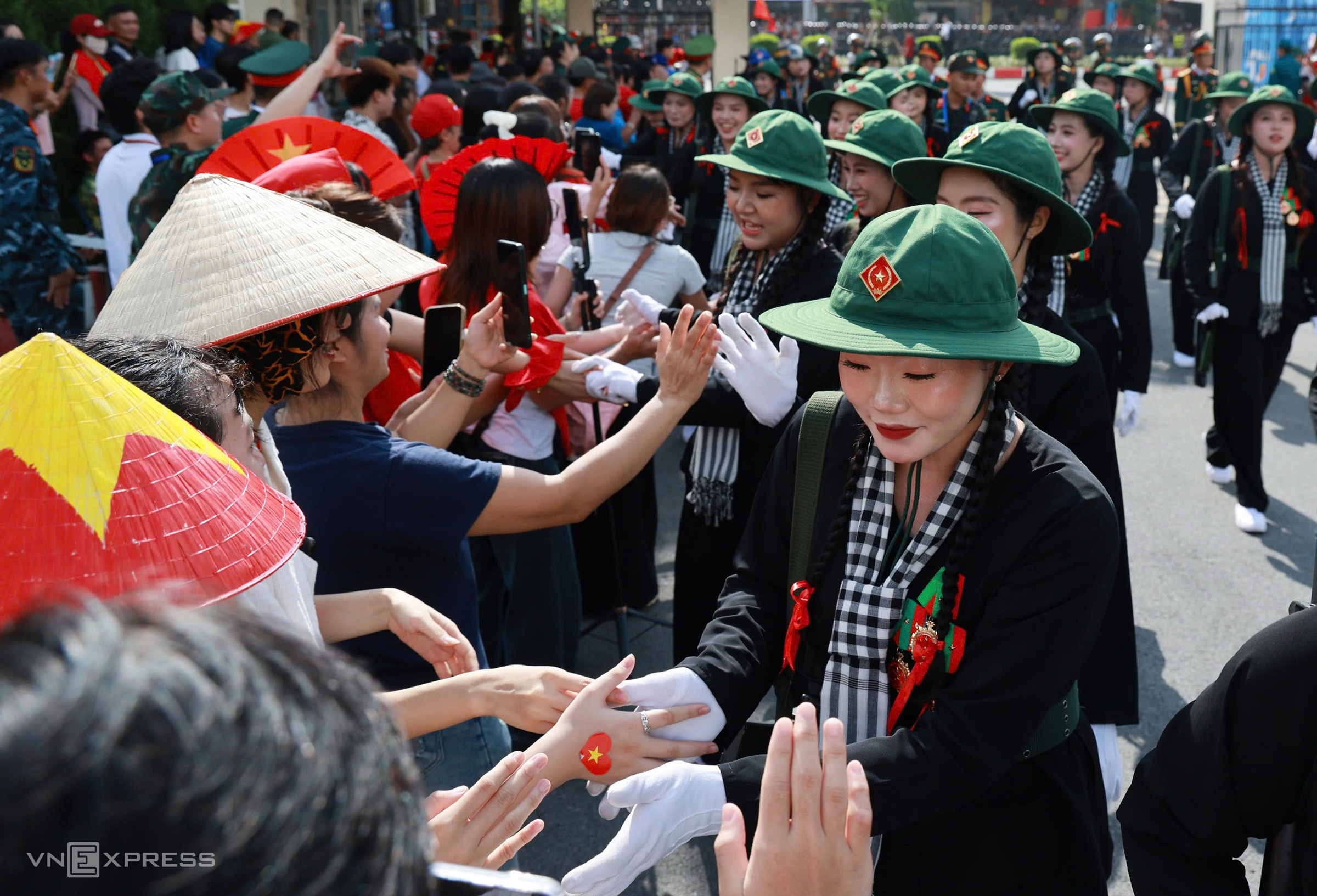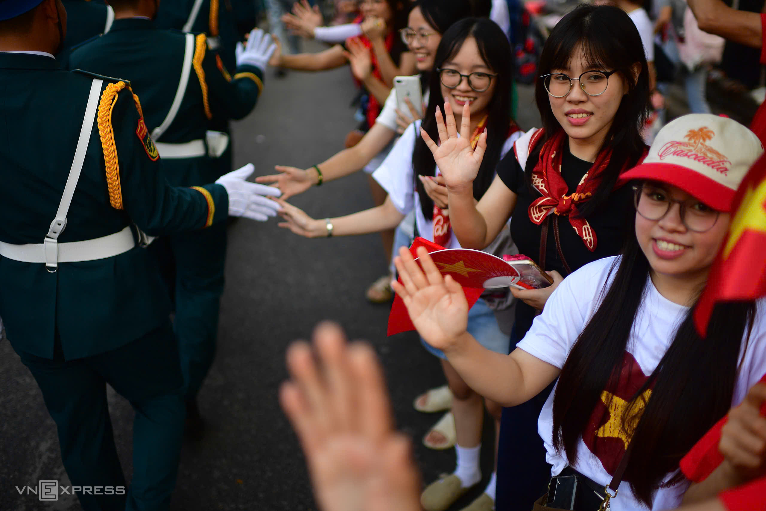 Military police, the guardians of order within the army, shake hands and bid farewell to people lining Tran Khanh Du Street as they lead their contingent back to their designated area. Photo: Tran Quynh