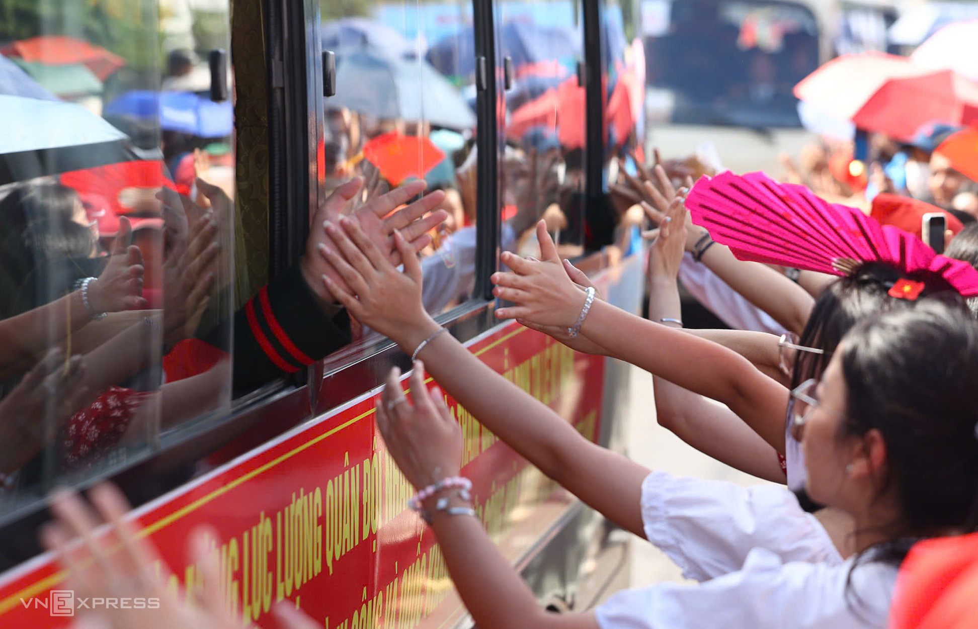 People wave to the engineer corps, the "pathfinders of victory" during wartime and pioneers in bridge building and road construction today. Photo: Duc Dong