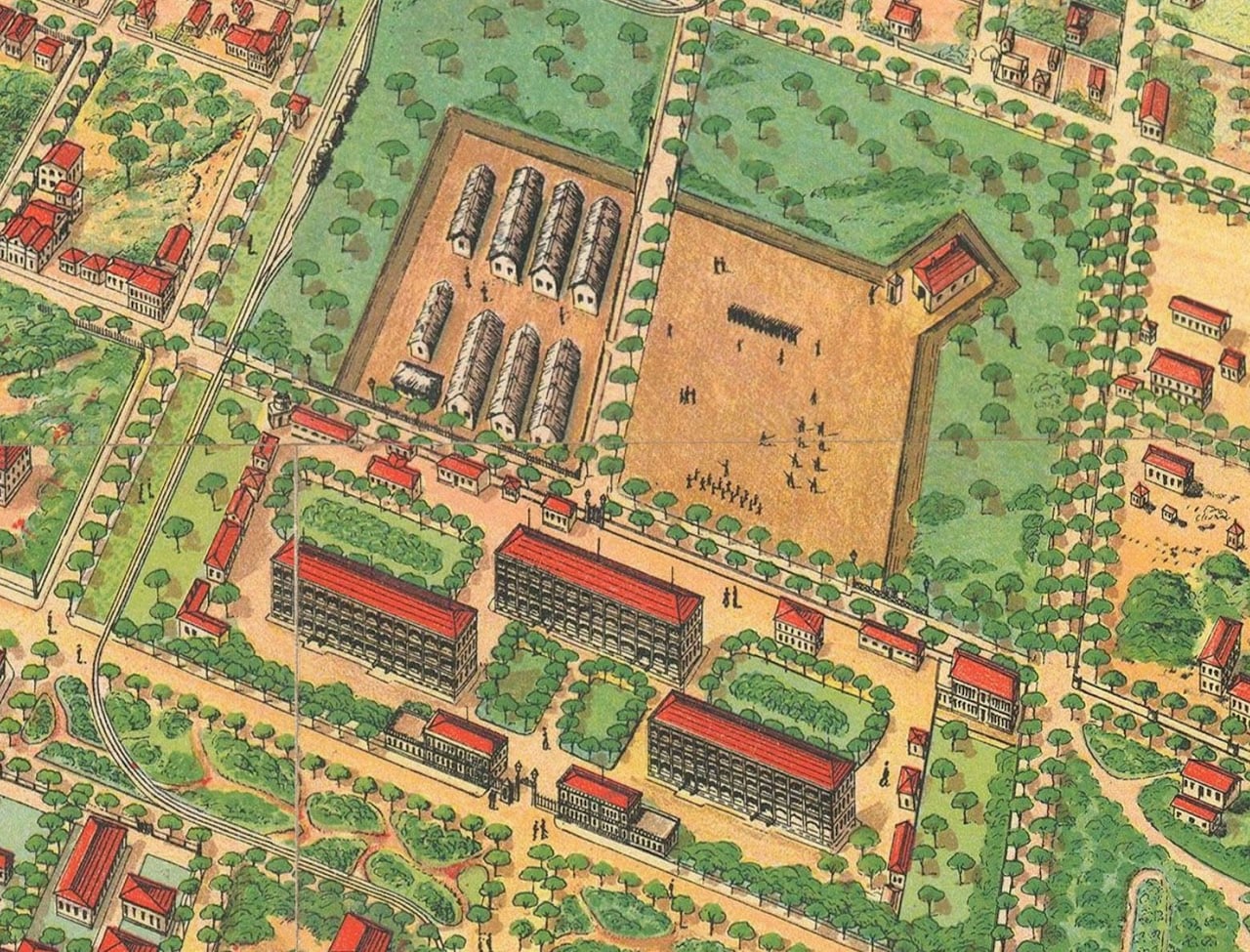 The road construction divided the old city gate into two independent blocks, as they appear today. In Gaston Pusch's 1898 panoramic map of Sai Gon, this area was a large complex with many training barracks and civilian structures.