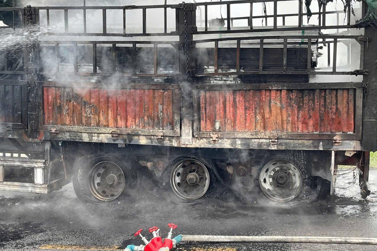 After several tens of minutes, the blaze was brought under control. However, all the rear tires were burned away, and the rear section of the vehicle was severely damaged.