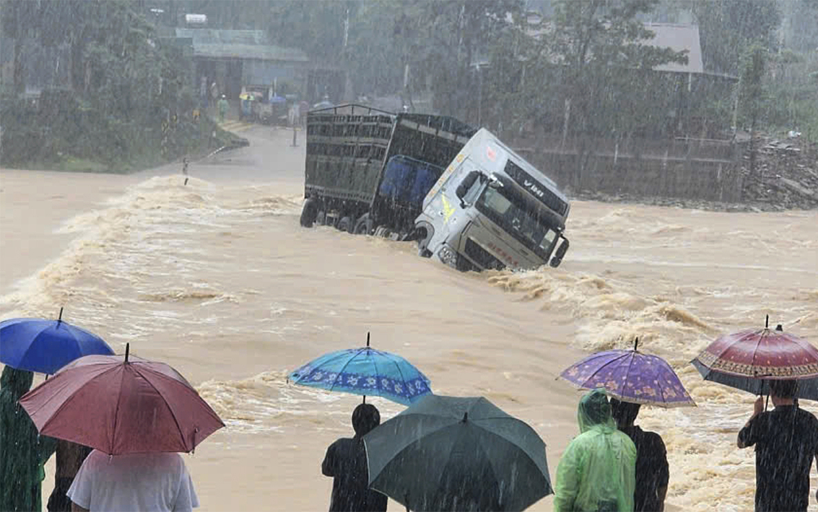 A tractor-trailer is swept away while attempting to cross a swiftly flowing spillway bridge. *Photo: Van Do*
