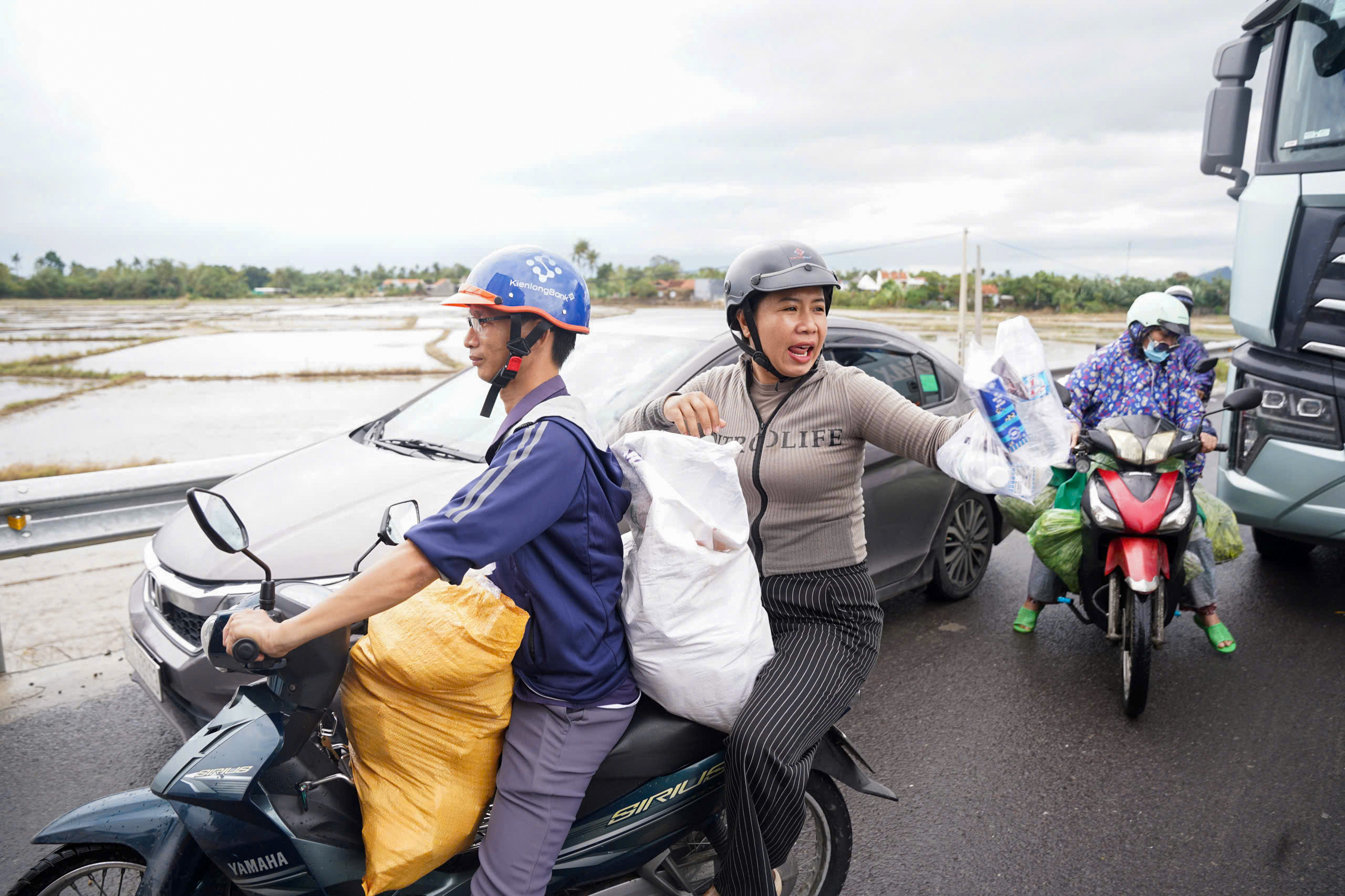 Mrs. Hoa, who traveled by motorbike from Nha Trang to Van Ninh (about 80 km), cooked over 200 meals with her family to provide food for drivers stranded on national route 1.