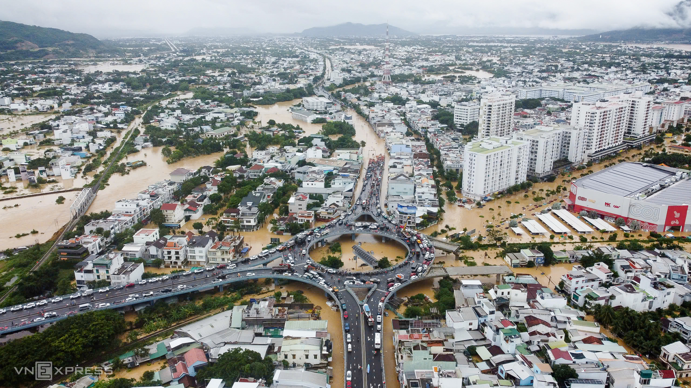 All branches at the Ngoc Hoi intersection are congested with vehicles. Some routes leading to central Nha Trang are deeply submerged, cutting off access.