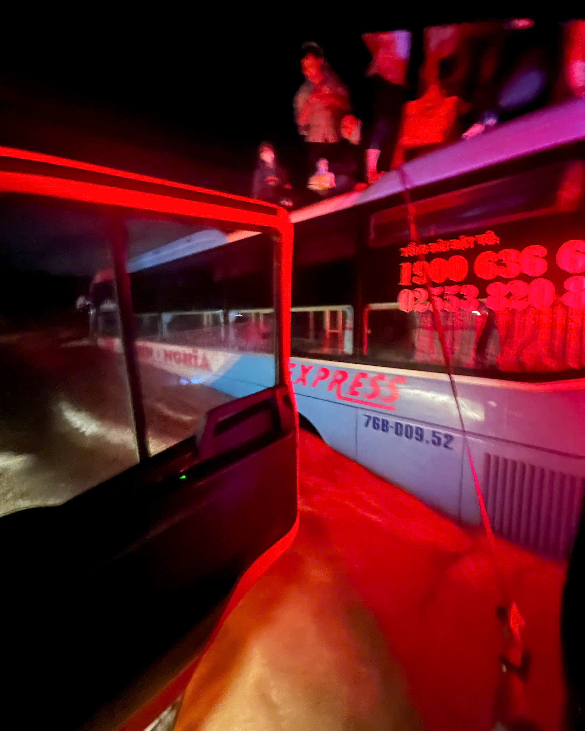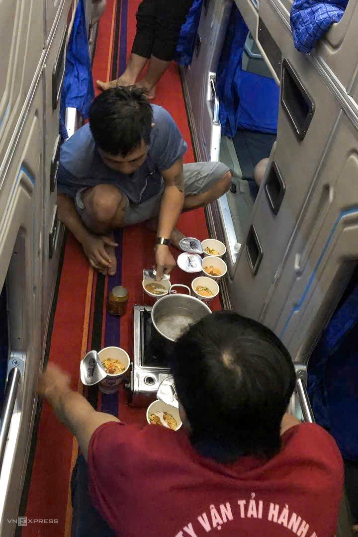 Hanh khach, nhan vien nha xe nau mi goi tren xe de do doi. _Passengers and bus staff cooked instant noodles on the vehicles to alleviate hunger._
