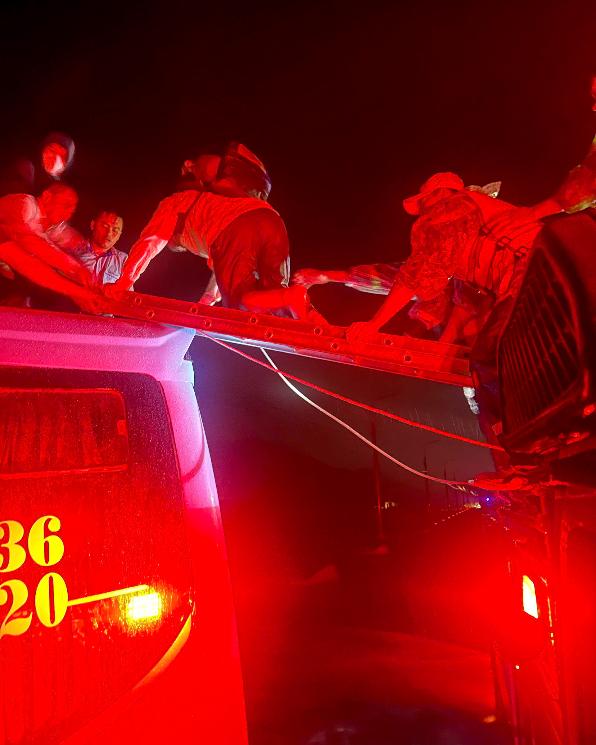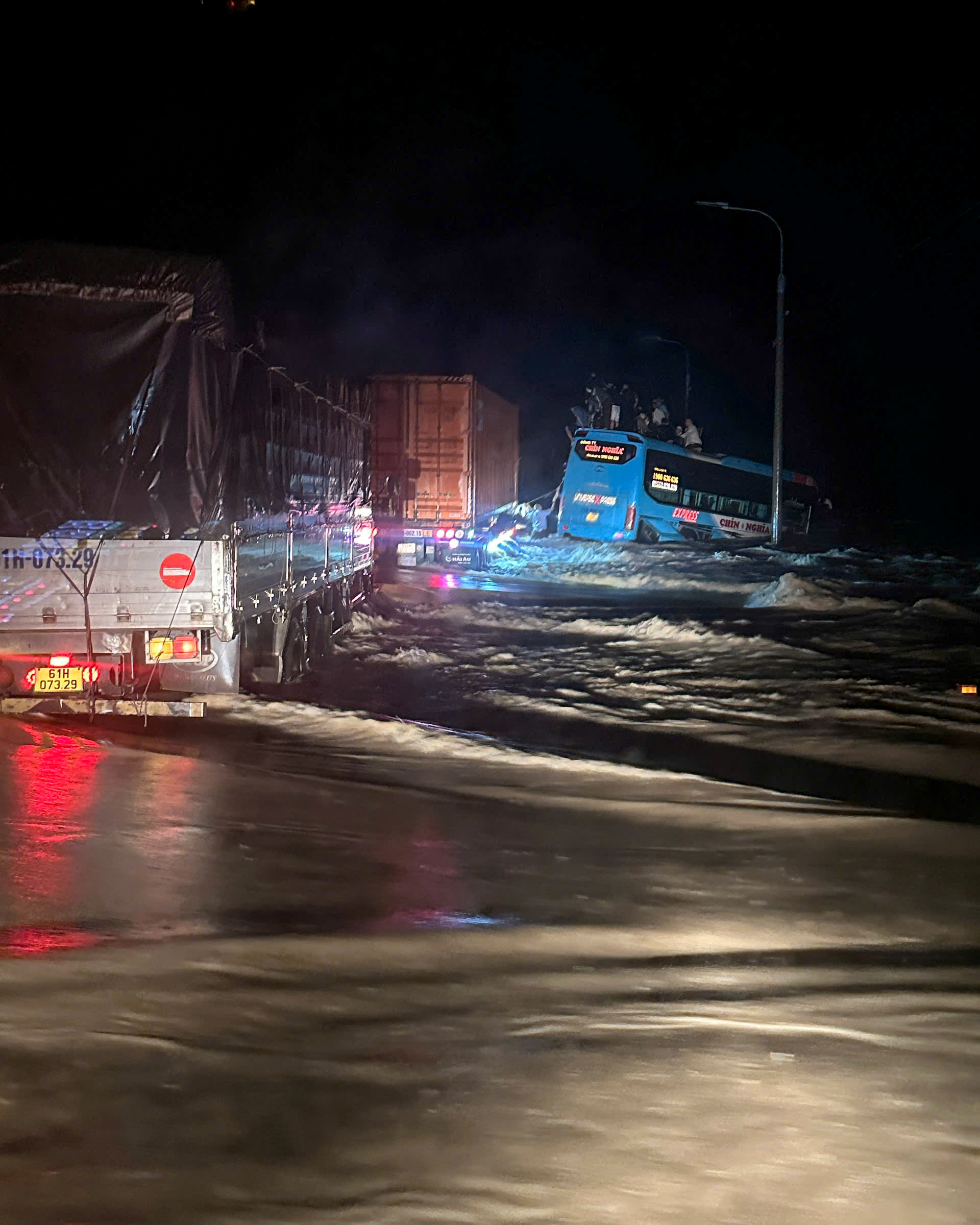 Early this morning, on national highway 1A near Cau Lung bridge in Dien Khanh commune, Khanh Hoa province, a 40-seat passenger bus carrying 33 people traveling from TP HCM to Quang Ngai was swept away by floodwaters. Firefighting and Rescue Team Area 4 quickly arrived and initiated rescue operations for both the people and the vehicle.