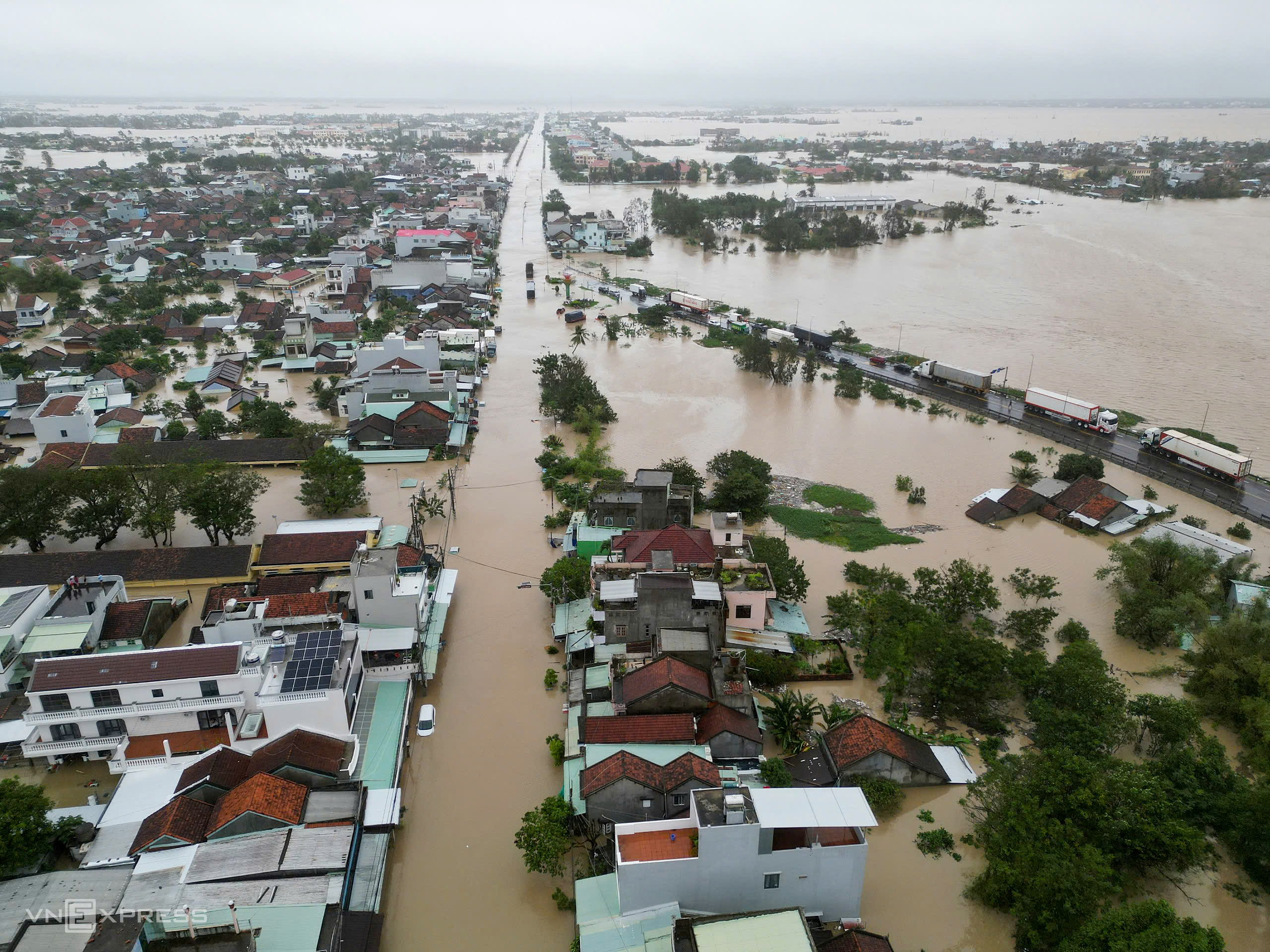 Quoc lo 1A doan qua xa Dong Hoa, tinh Dak Lak chim trong nuoc lu. _National highway 1A, the section through Dong Hoa commune, Dak Lak province, is submerged in floodwaters._