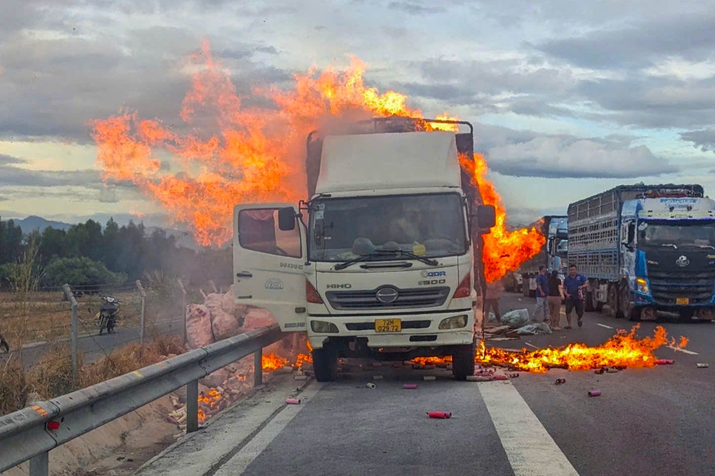 Upon discovering the incident, the driver pulled the vehicle into the emergency lane. Other drivers on the expressway stopped to assist with extinguishing the fire, pulling many sacks of goods onto the road to minimize damage.