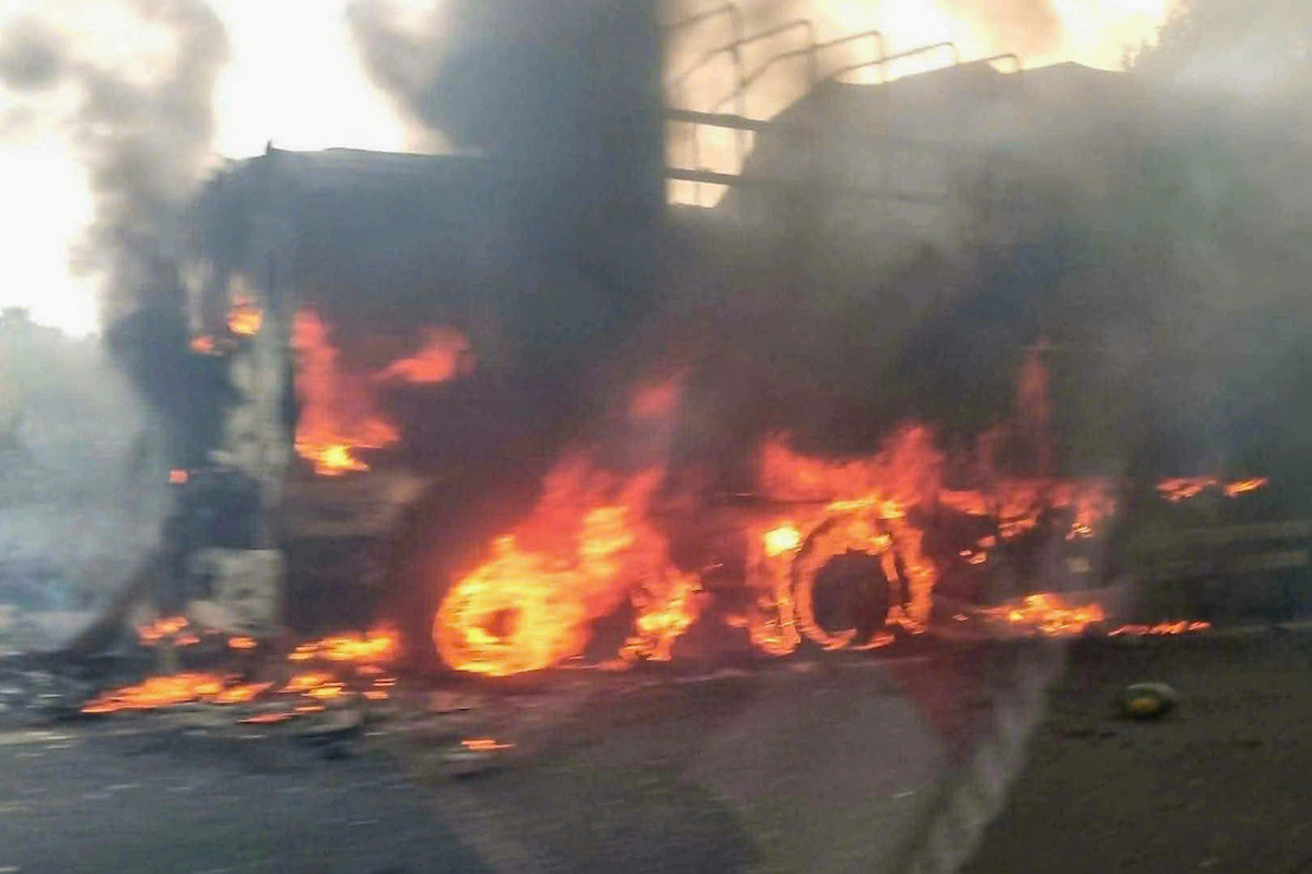 Truck engulfed in flames on the expressway. Photo: Thai Ha
