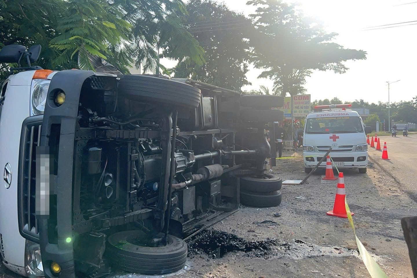 Around 4 pm, a Lam Dong-registered truck carrying 4 tons of seafood and driven by a 37-year-old man, with two women also on board, was traveling from Vung Tau to Phan Thiet. As it approached the Cam Binh market area in Phuoc Hoi ward, the truck overturned and slid onto the roadside.