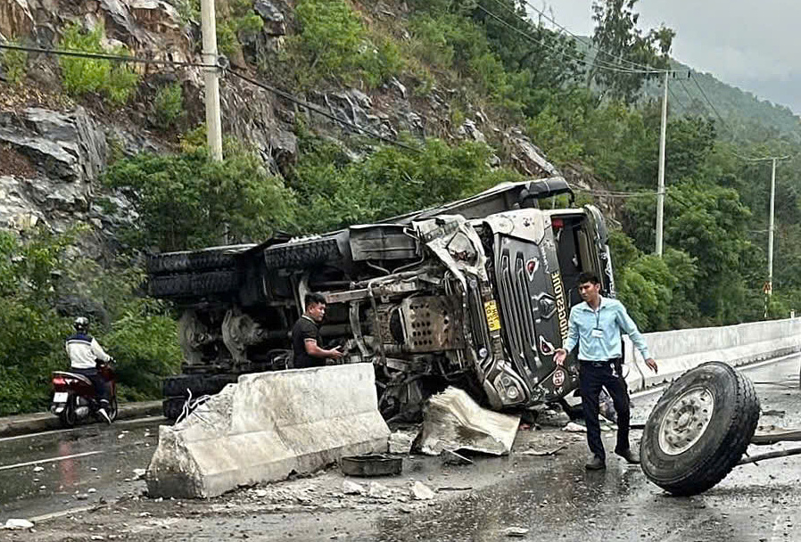 Around 3 PM, amid rainy conditions, 33-year-old driver Nguyen Xuan Hai was driving a truck registered in Khanh Hoa on Nguyen Tat Thanh Boulevard, heading from Nha Trang towards Cam Ranh Airport. Upon reaching Cu Hin Pass, the vehicle unexpectedly veered into the median, overturned, and blocked a portion of the road.