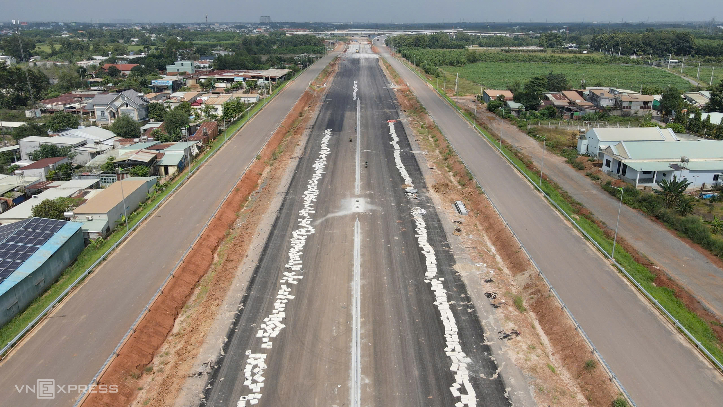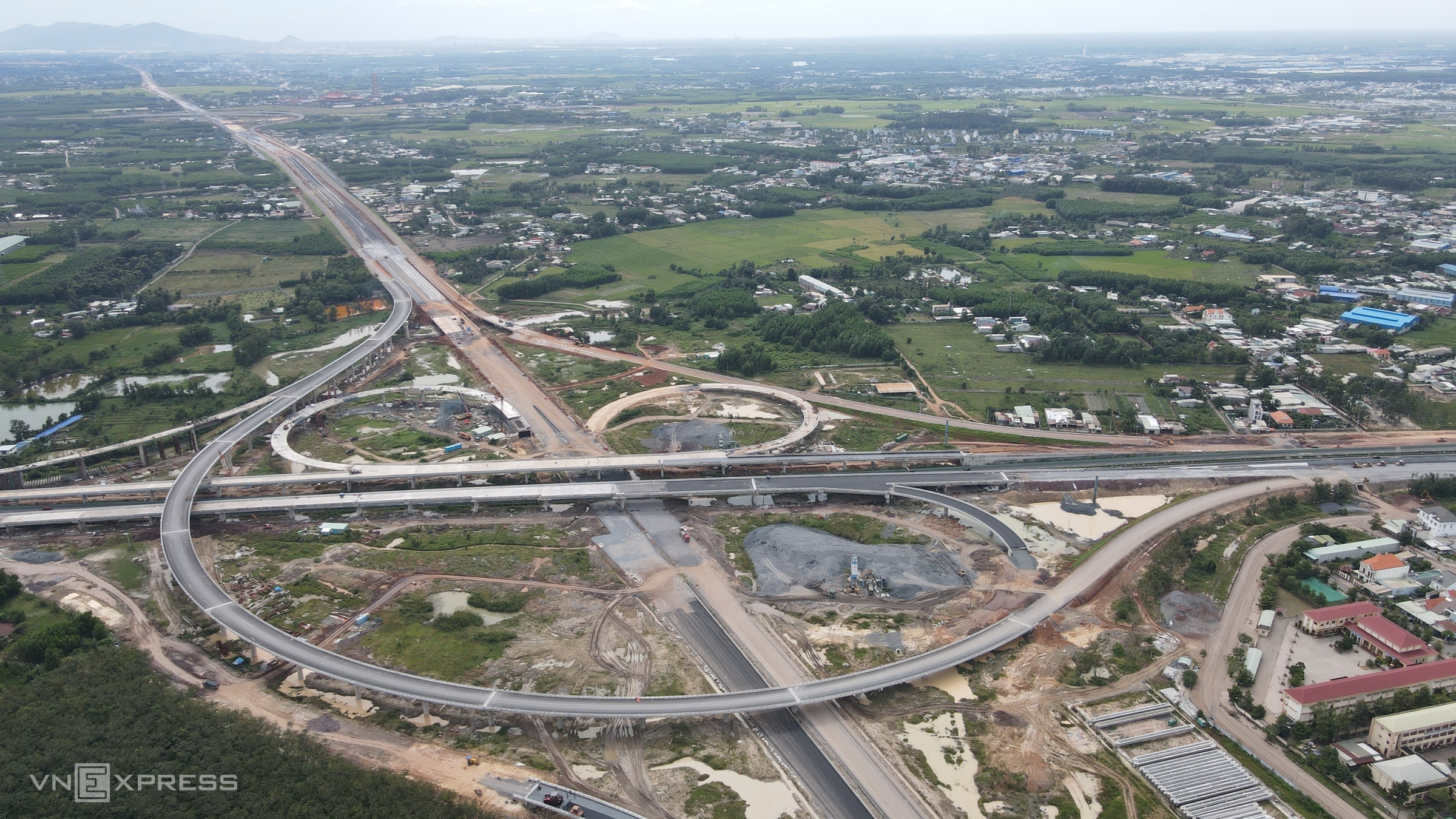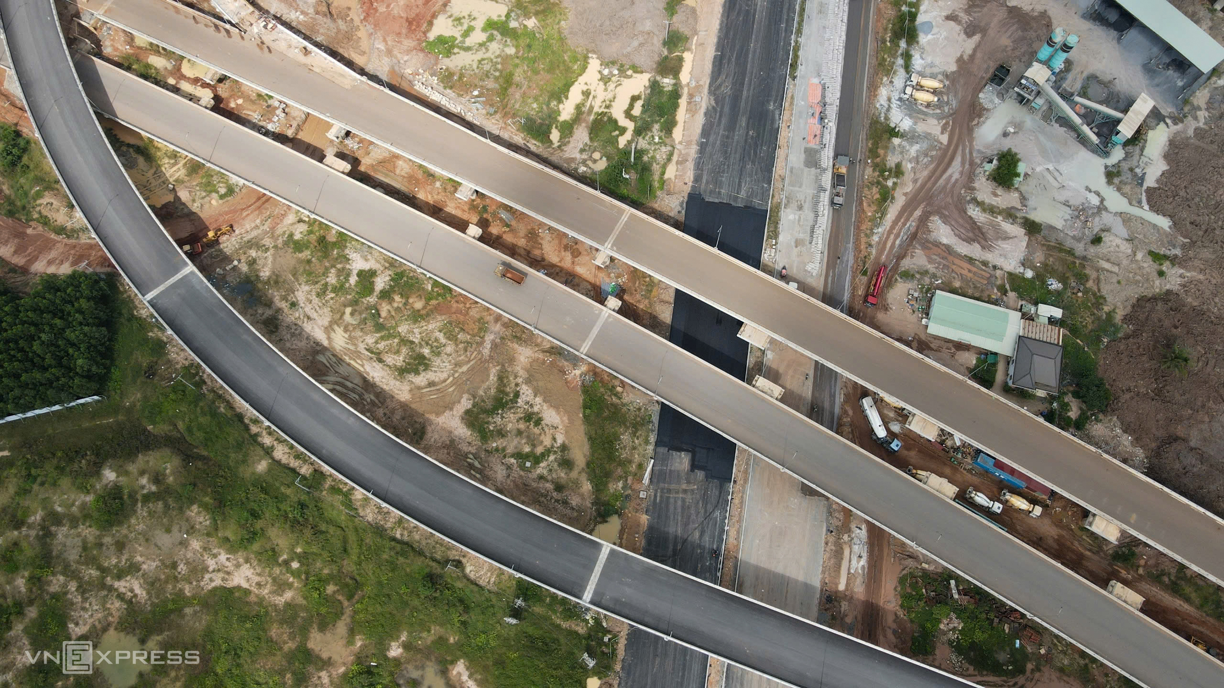 The overpass interchange crossing the Bien Hoa - Vung Tau Expressway has been paved and fitted with lights, awaiting road markings. Flanking it are slip roads connecting to Route T2 and the Ho Chi Minh City - Long Thanh - Dau Giay Expressway.