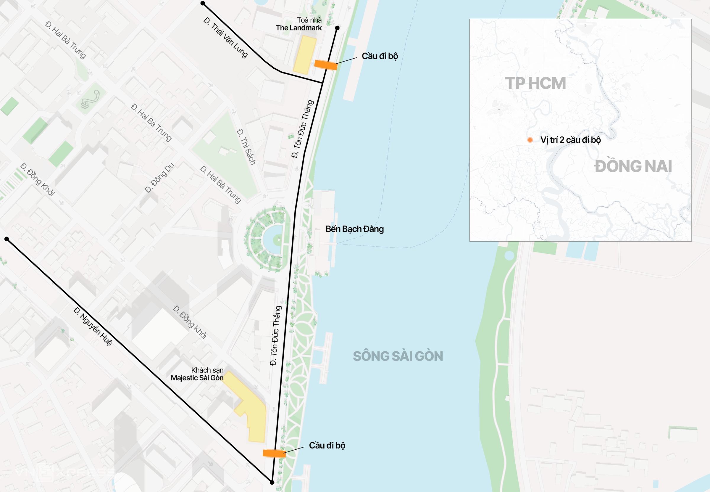 The two pedestrian bridges are planned for the intersections of Nguyen Hue - Ton Duc Thang (in front of Majestic Saigon Hotel) and Thai Van Lung - Ton Duc Thang (near The Landmark building).