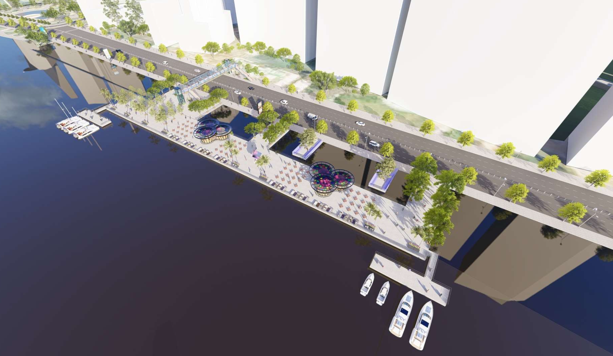 An artist's impression shows residents and tourists relaxing in the Pier C area, with Ba Son Bridge in the foreground.