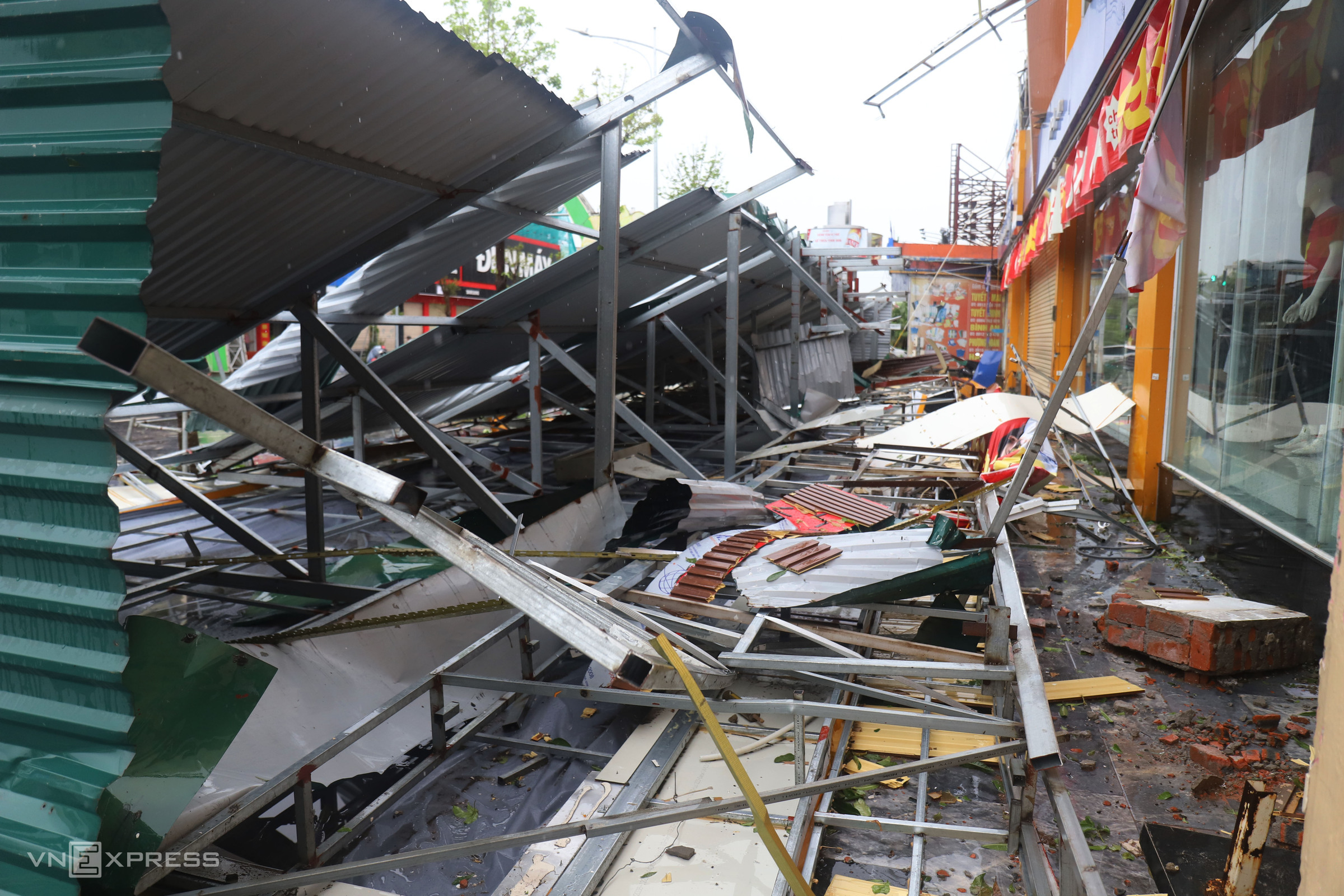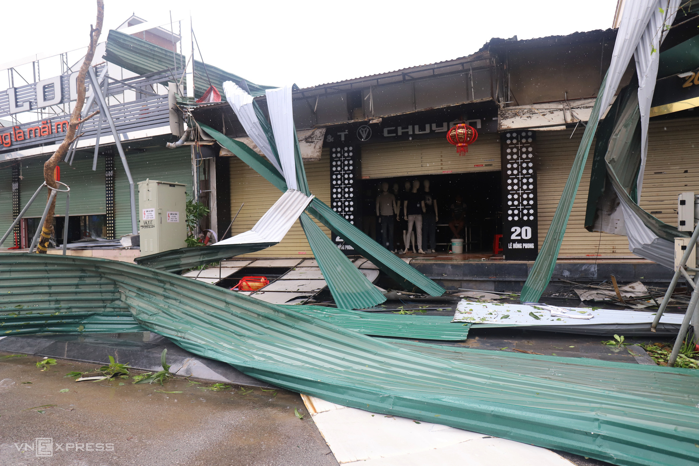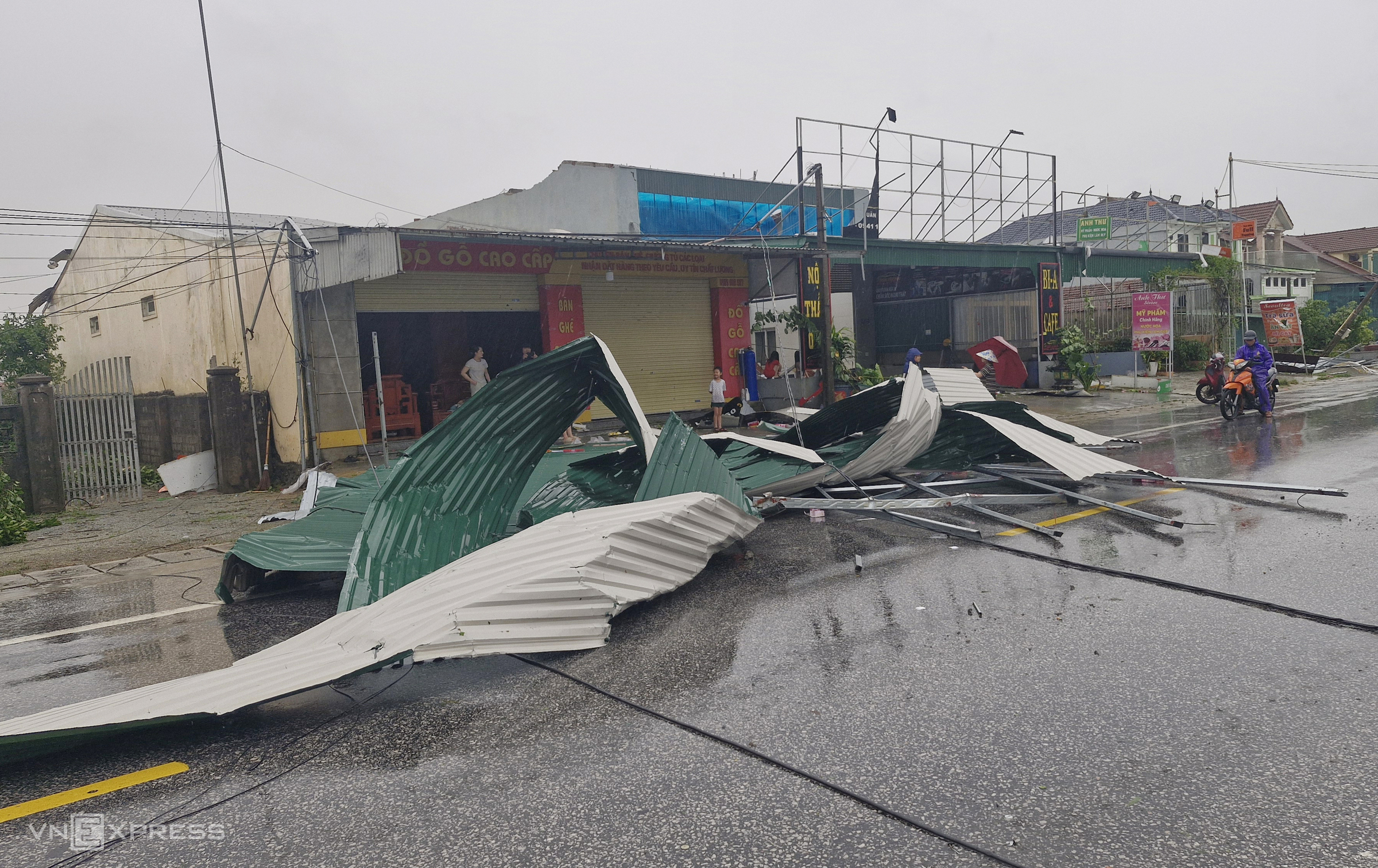 A shop on Le Duan Street in Nghe An province collapsed, its steel frame and roof in a tangled heap, crushing advertising signs. Photo: Duc Hung