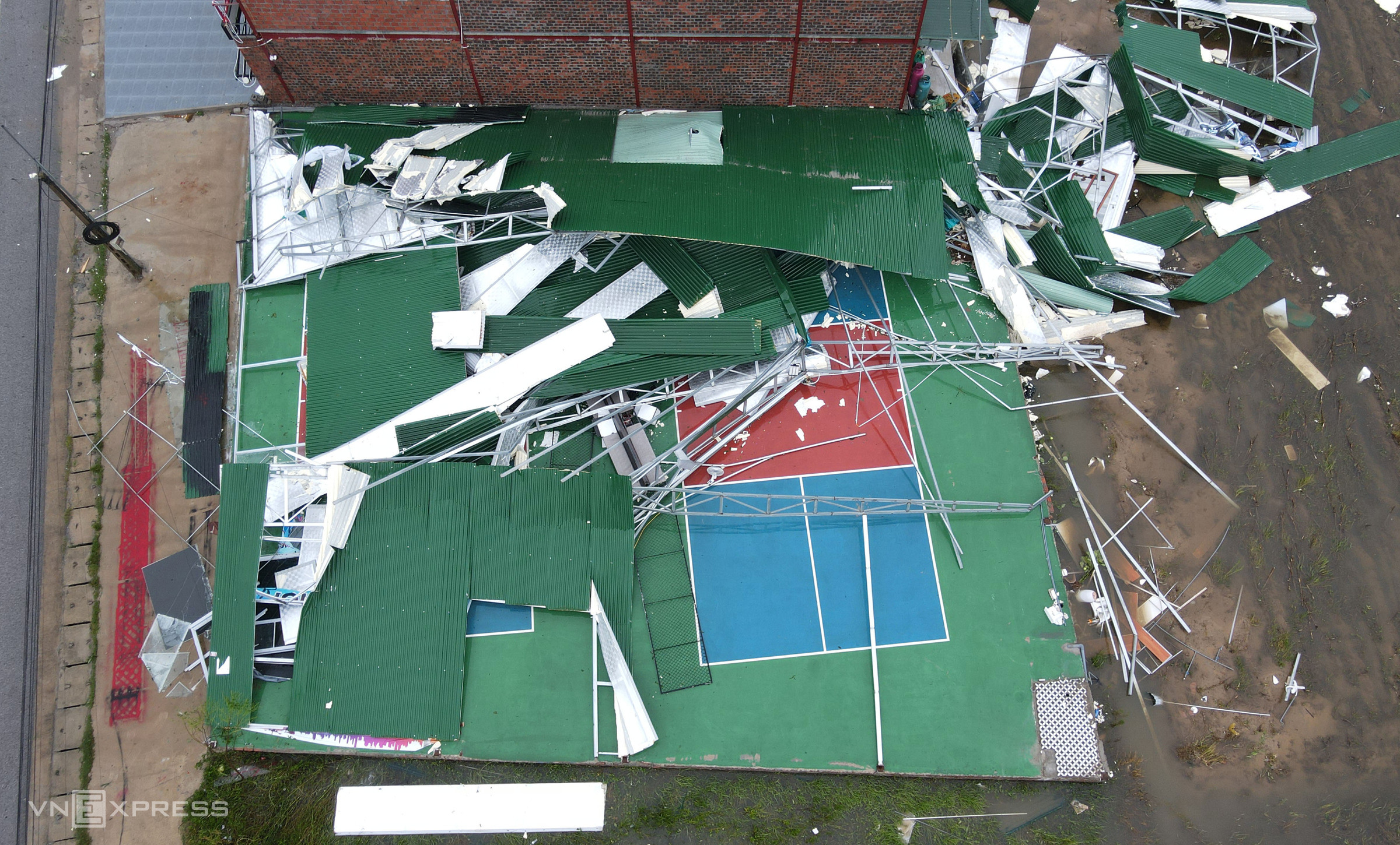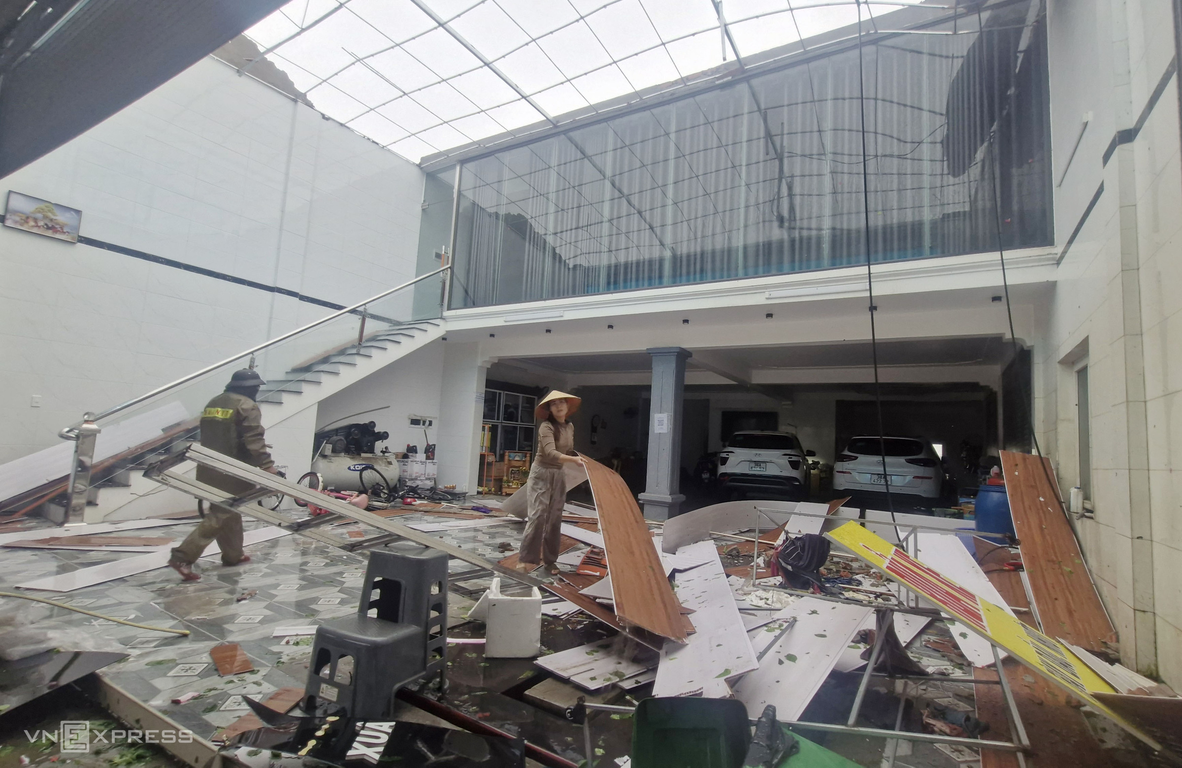 The 300-square-meter home of 43-year-old Tran Thi Loc, located in Cuong Thinh village, also houses a car wash. Last night, the wind ripped off the roof, damaging property and car wash equipment.