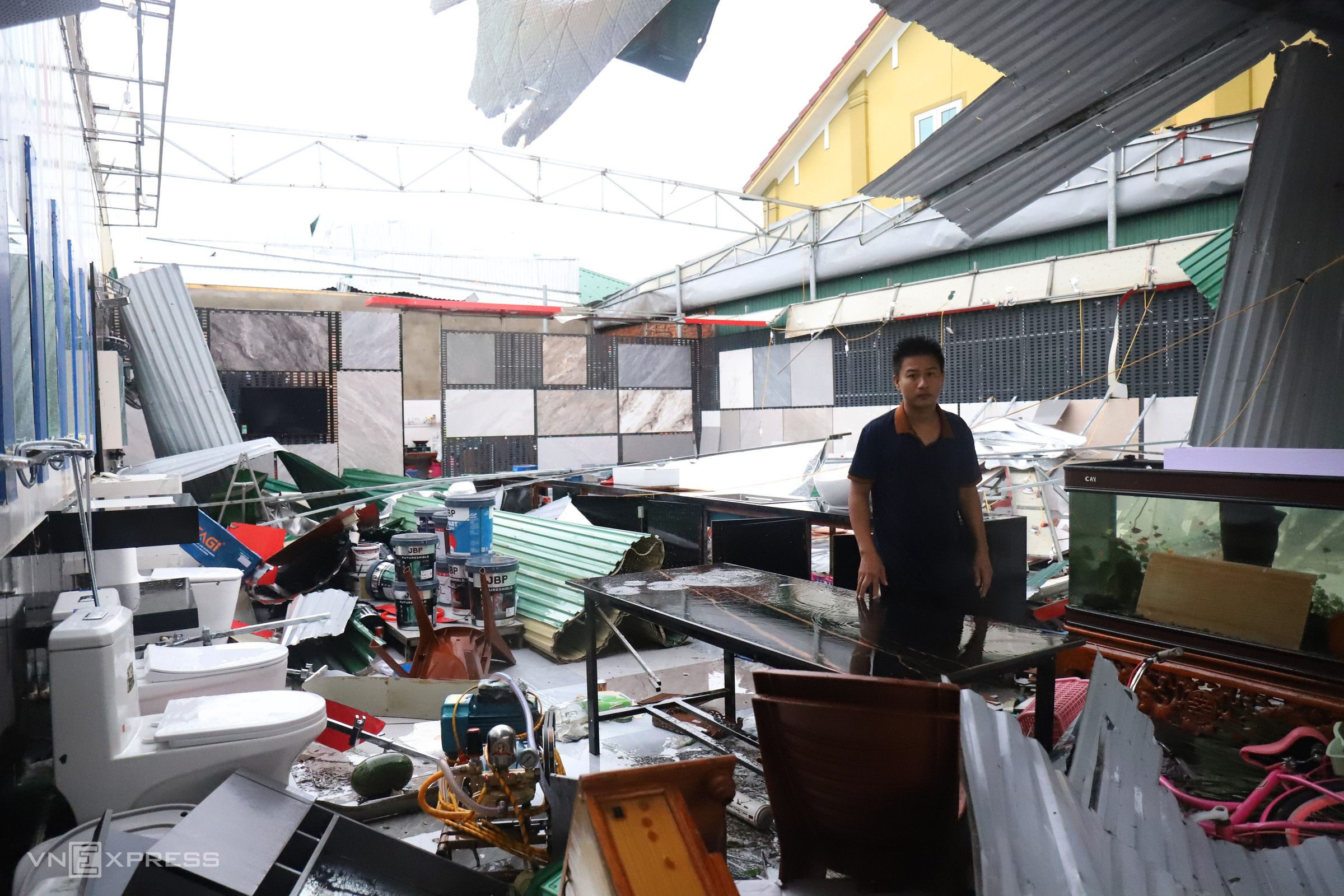 Nguyen Van Dao, 35, the owner of a construction materials store in Lam Vuong village, Co Dam commune, said strong winds at 8 p.m. on 25/8 ripped the entire roof off his shop. The roof crushed merchandise, forcing his family to seek shelter with neighbors, unable to salvage anything.