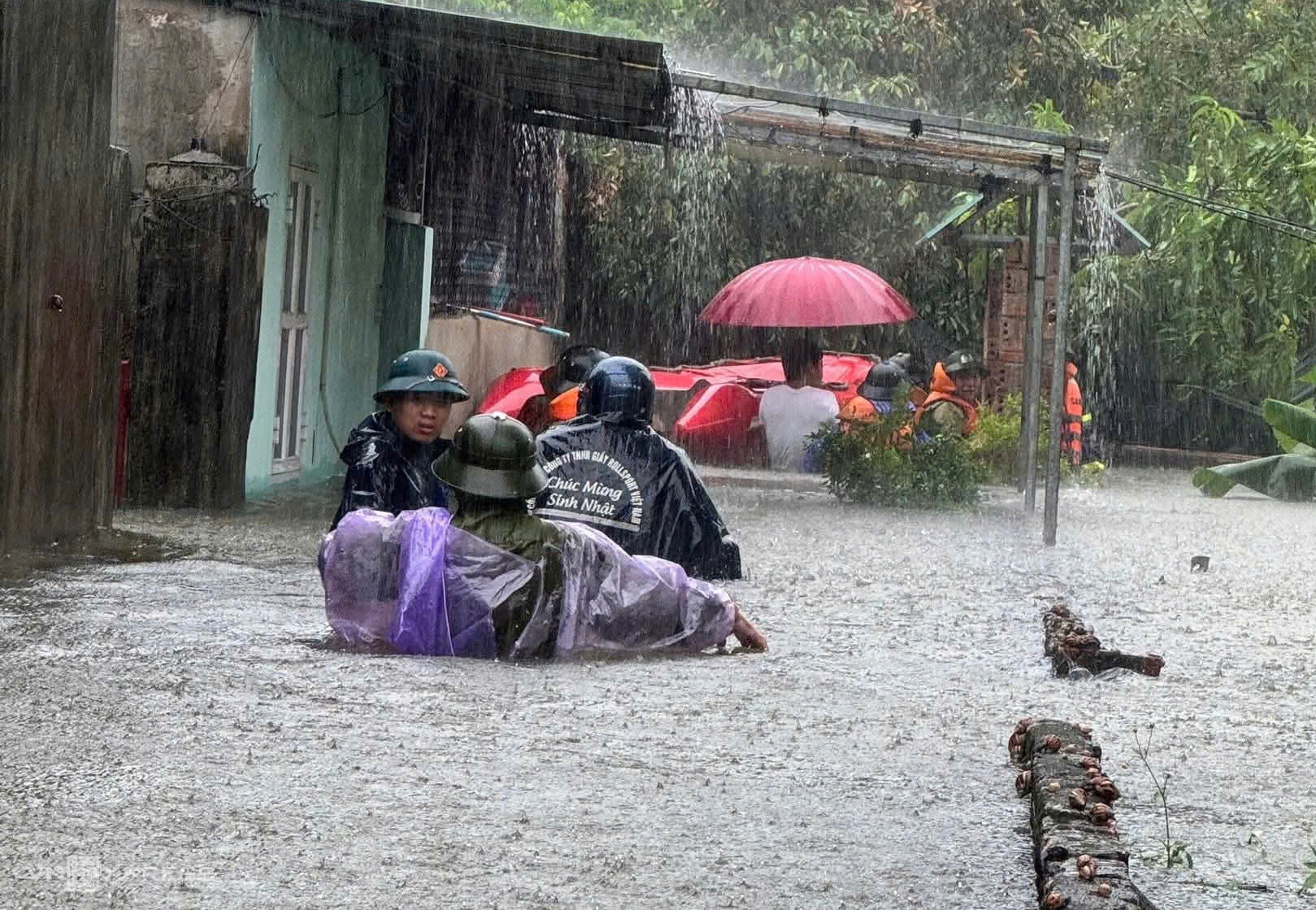 On the morning of 26/8, many areas in Thanh Hoa were flooded due to heavy rain, with water levels reaching 1-2 meters in some places. Rescue police from the Thanh Hoa Provincial Police Department evacuated six households at Lane 17, Tran Khat Chan Street, Long Quang Quarter, Ham Rong ward to safety. Photo: Le Hoang