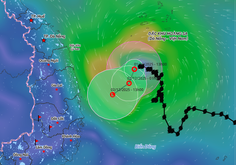 Two days after entering the Bien Dong, when it was 190 km from Song Tu Tay island, the typhoon reached its peak intensity at level 12, with gusts up to level 15. At that time, Vietnam's meteorological agency presented two possible paths for the storm. The scenario with an 80% probability predicted that when the storm was approximately 500 km off the coast of Gia Lai and Khanh Hoa, it would change direction northward, weaken into a tropical depression, then into a low-pressure area, and drift towards the South Central Coast.