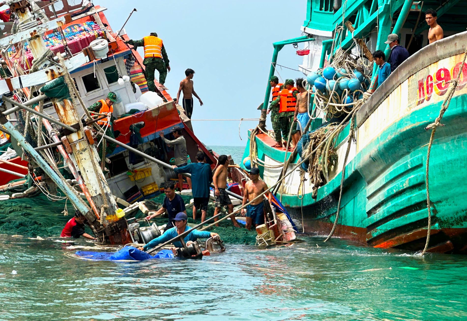 Soldiers from Hon Chuoi Border Post and fishermen aiding the distressed fishing vessel. *Hoang Ta* |