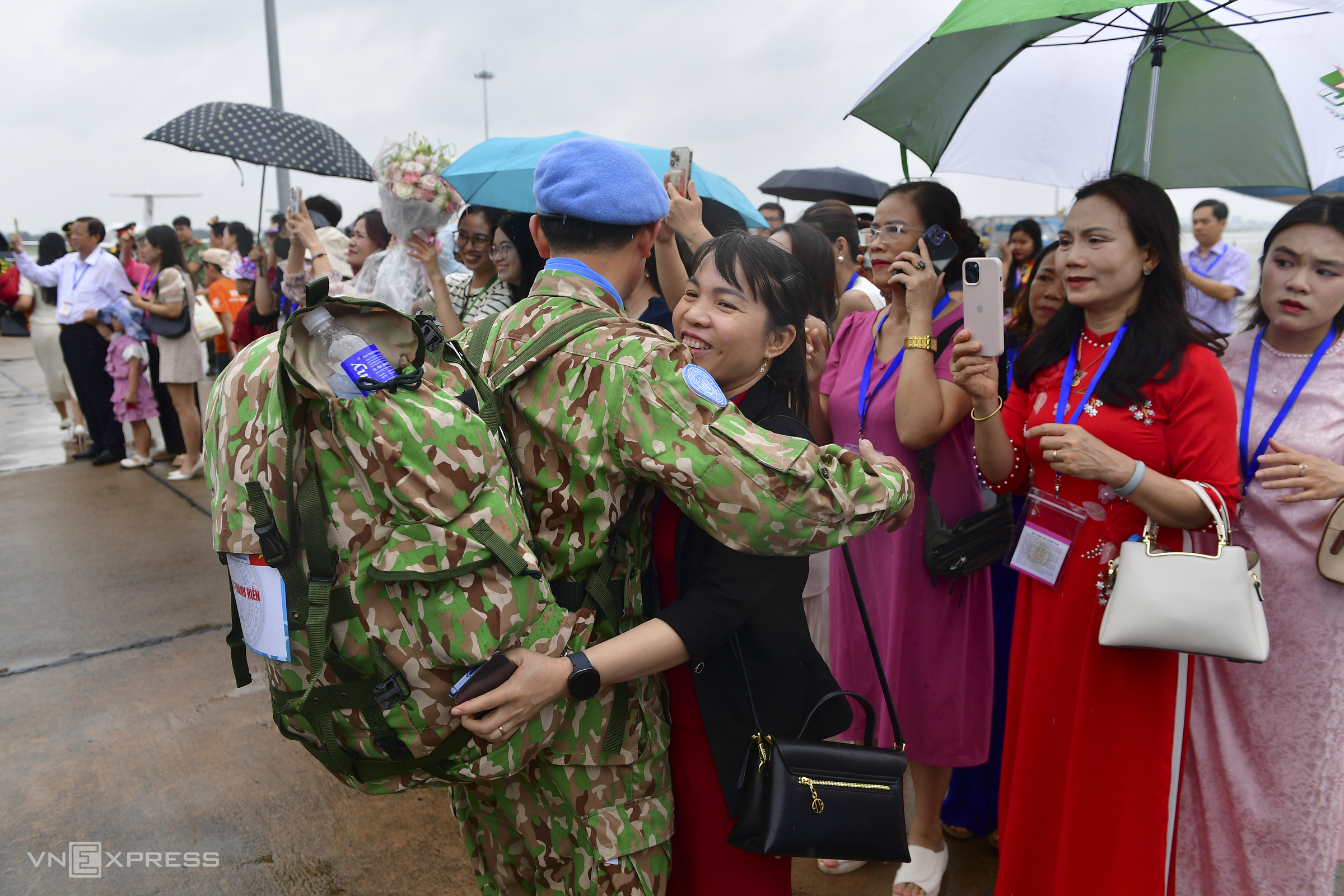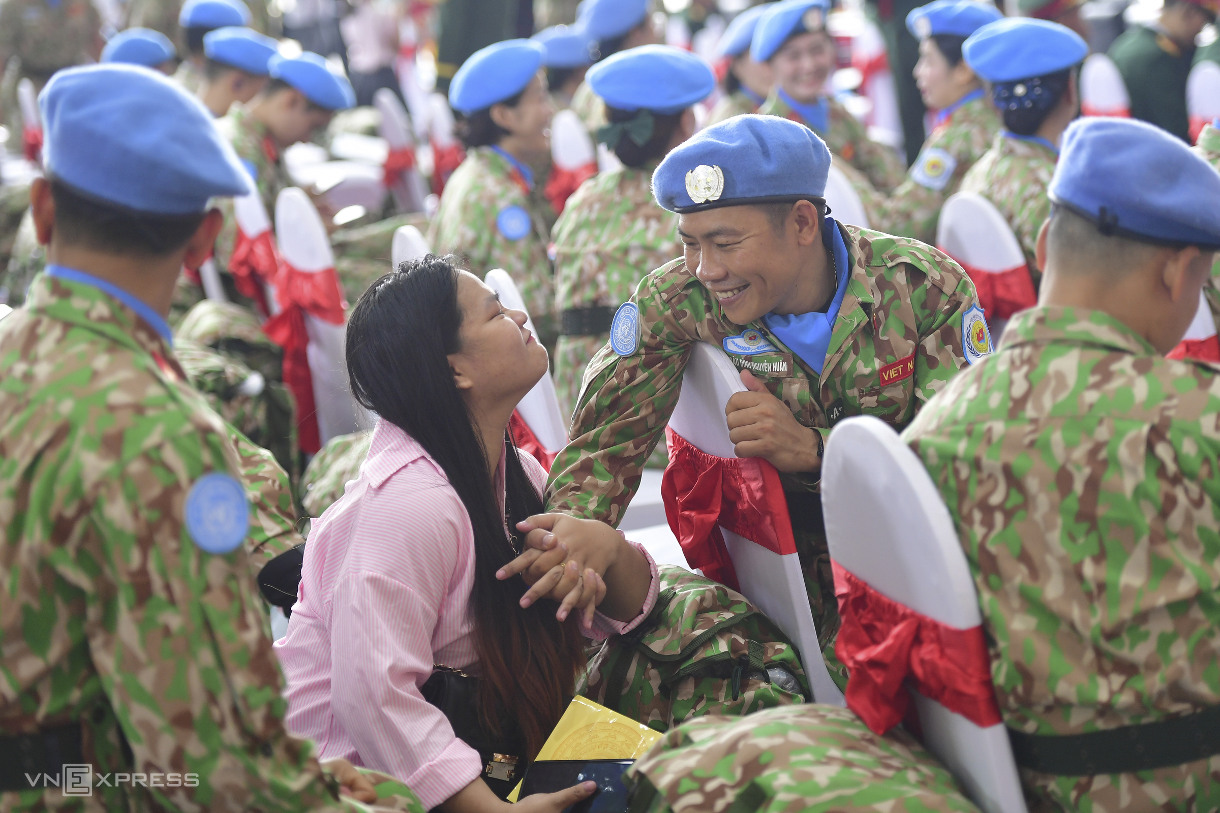 Before boarding, loved ones shared final moments with the departing peacekeepers. Nguyen Thi Hoai An bids farewell to her boyfriend, Dang Dinh Nguyen Huan. "I hope he stays healthy and performs his duties well," An said. |
