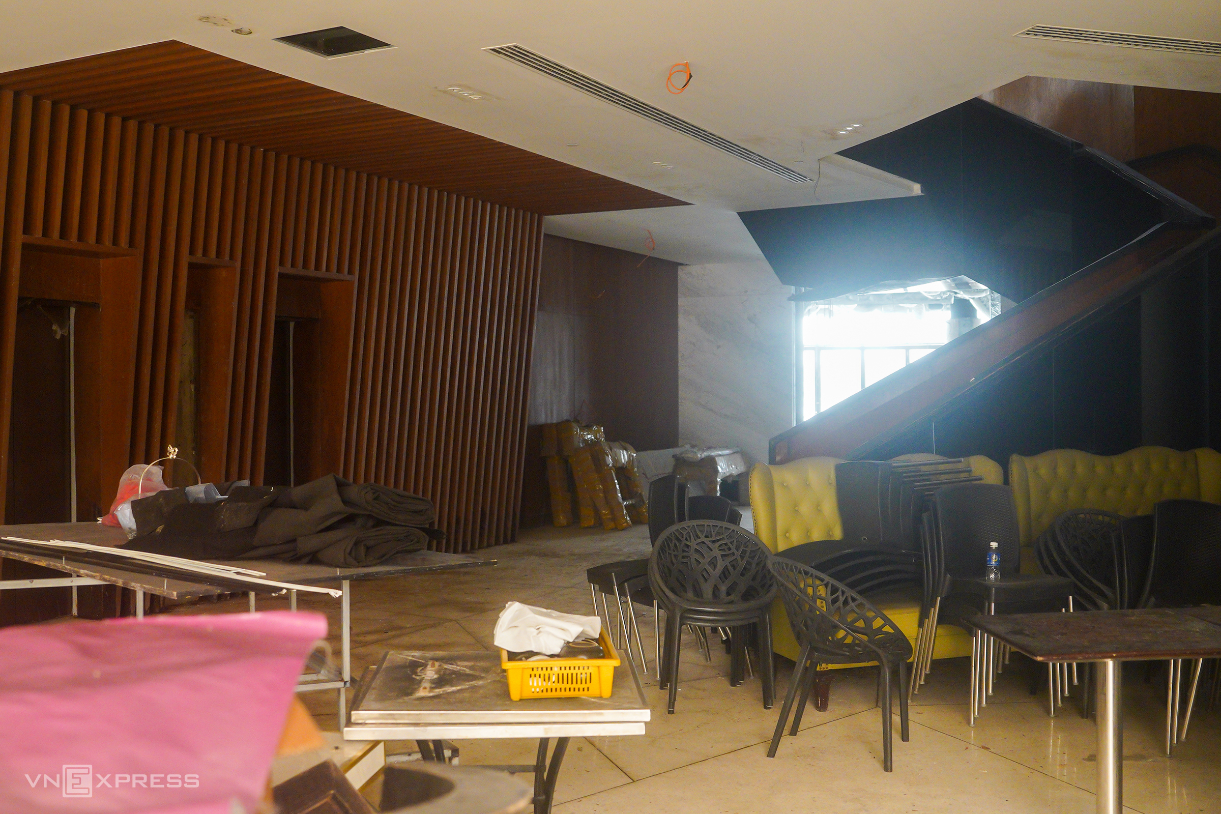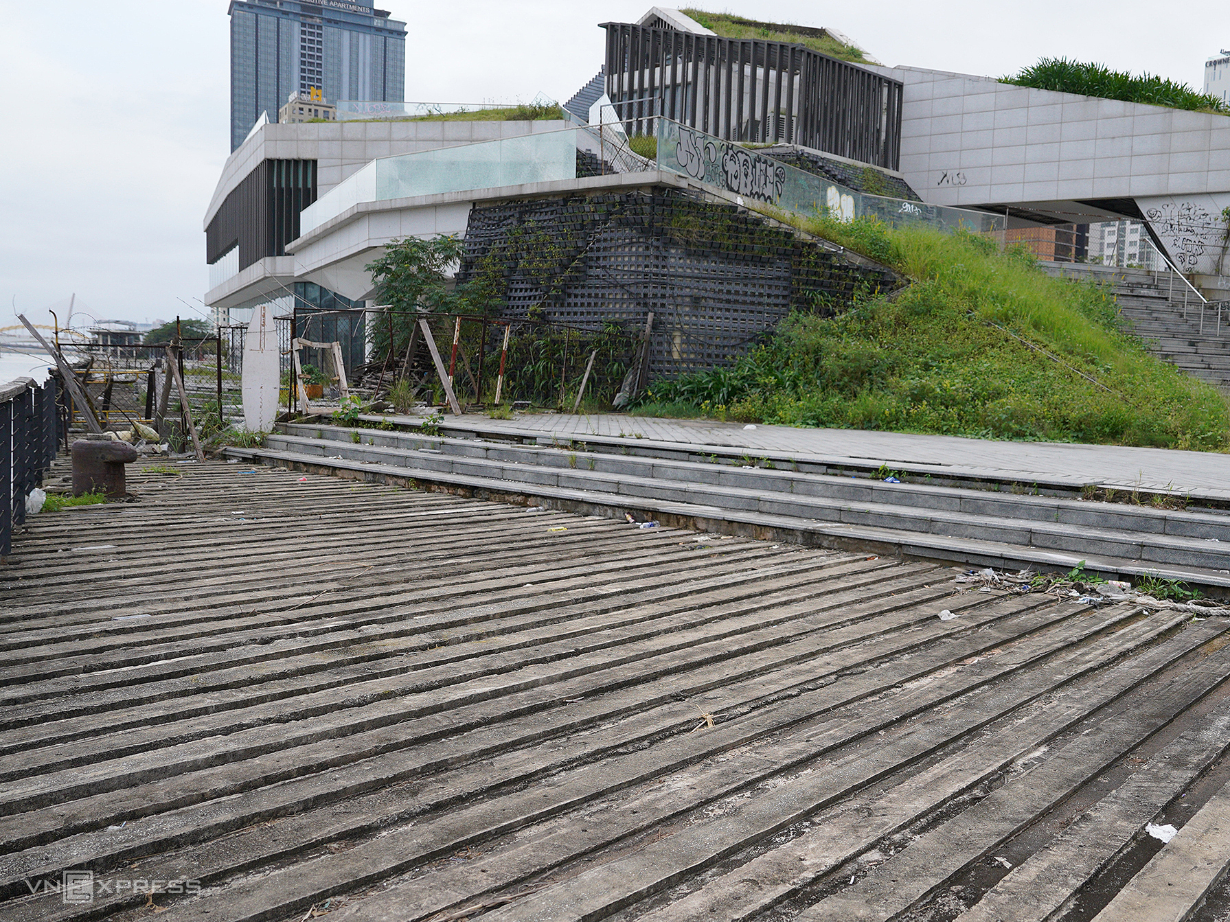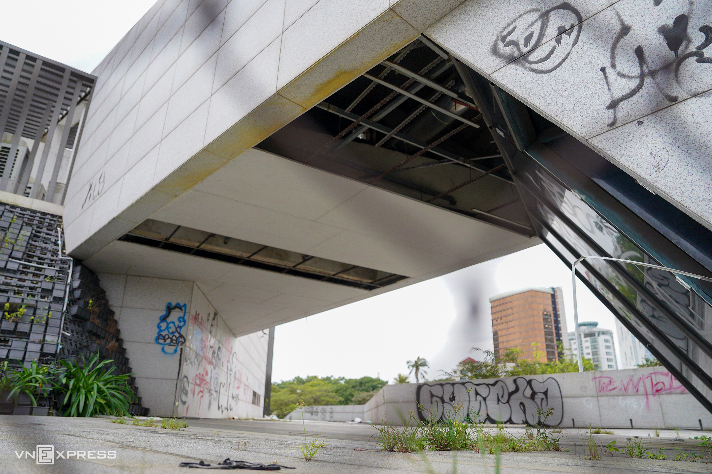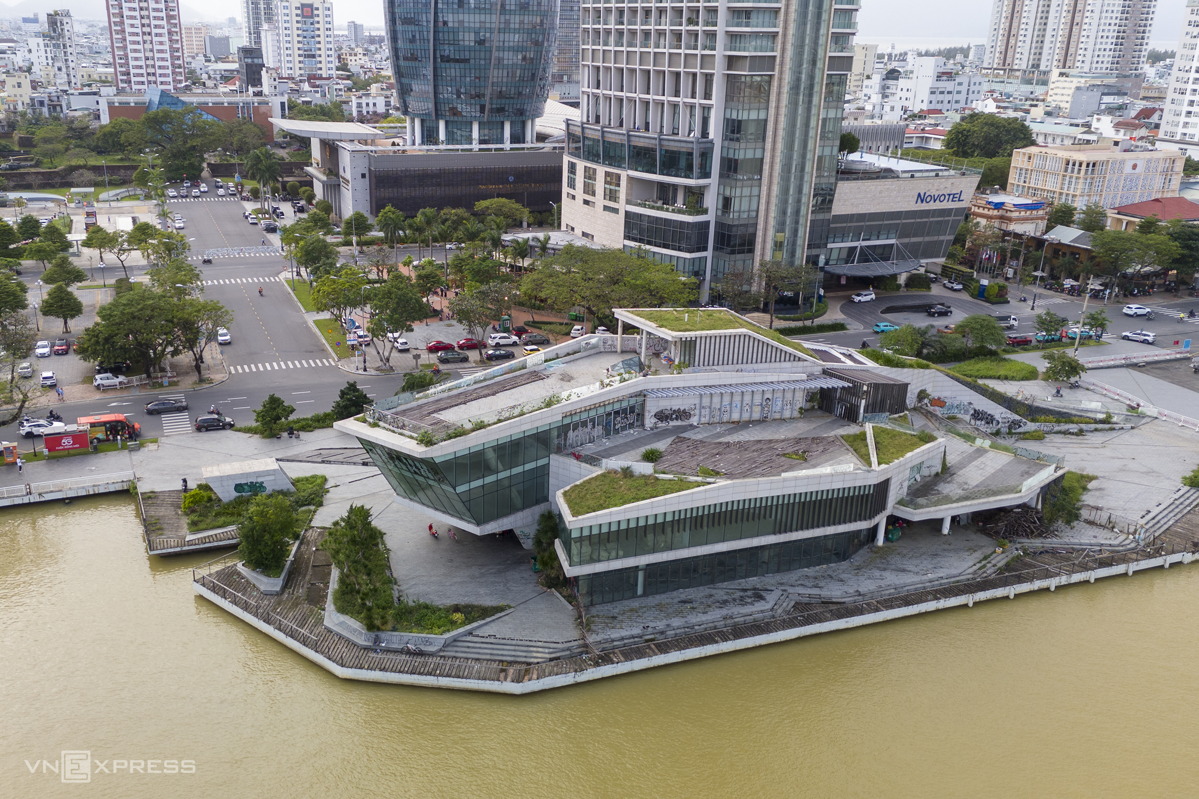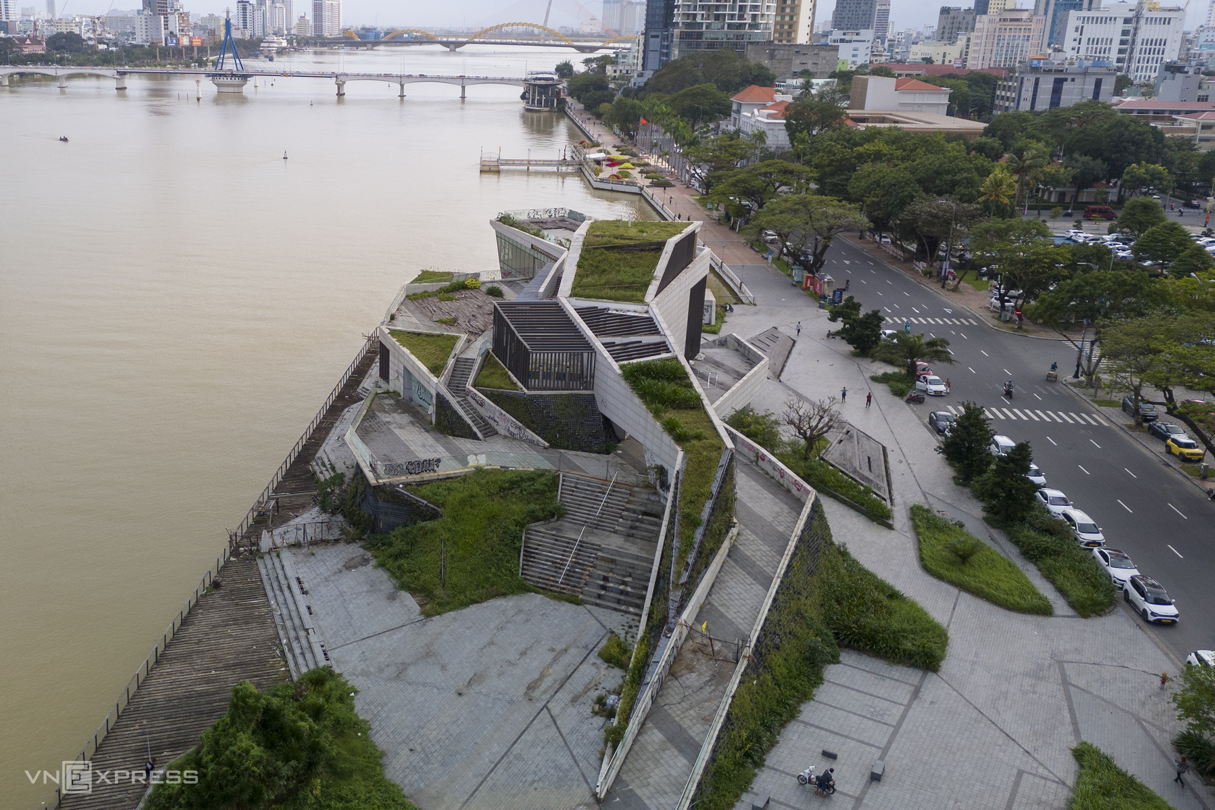 The structure boasts a prime location, nestled between the Da Nang Administrative Center building and the city's People's Council headquarters. It is bordered by the river to the east, Bach Dang street to the west, offers views of the Han River swing bridge to the south, and adjoins the Han River port to the north. The three-story building features a rooftop terrace with scenic views. However, prolonged abandonment has led to the deterioration of many elements.