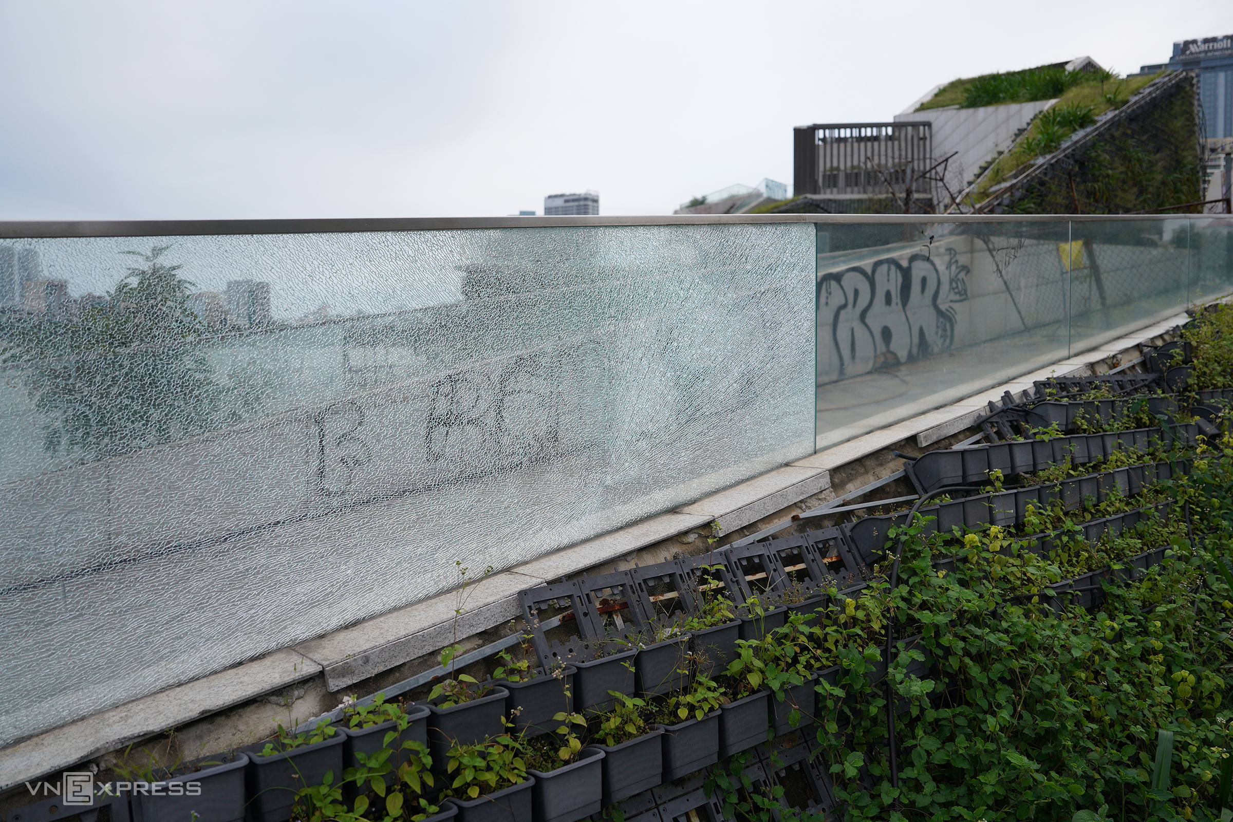 Numerous glass railings are broken, from the stairwells leading to upper floors to the 3rd-floor rooftop terrace of the yacht marina. |