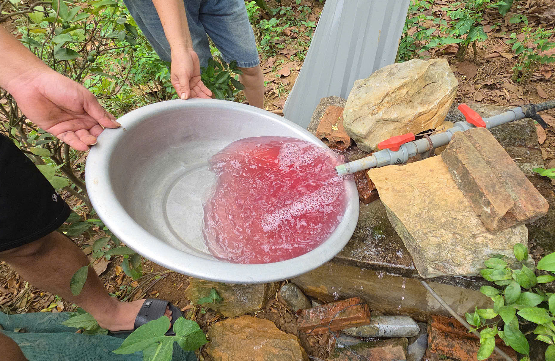Ms. Duong Thi Dung's family in Trung hamlet has a well nearly 30 m deep that has been stable for many years, but it is now unusable. When pumped, the water appears dark purple, gradually turning red, accompanied by an unusual smell.