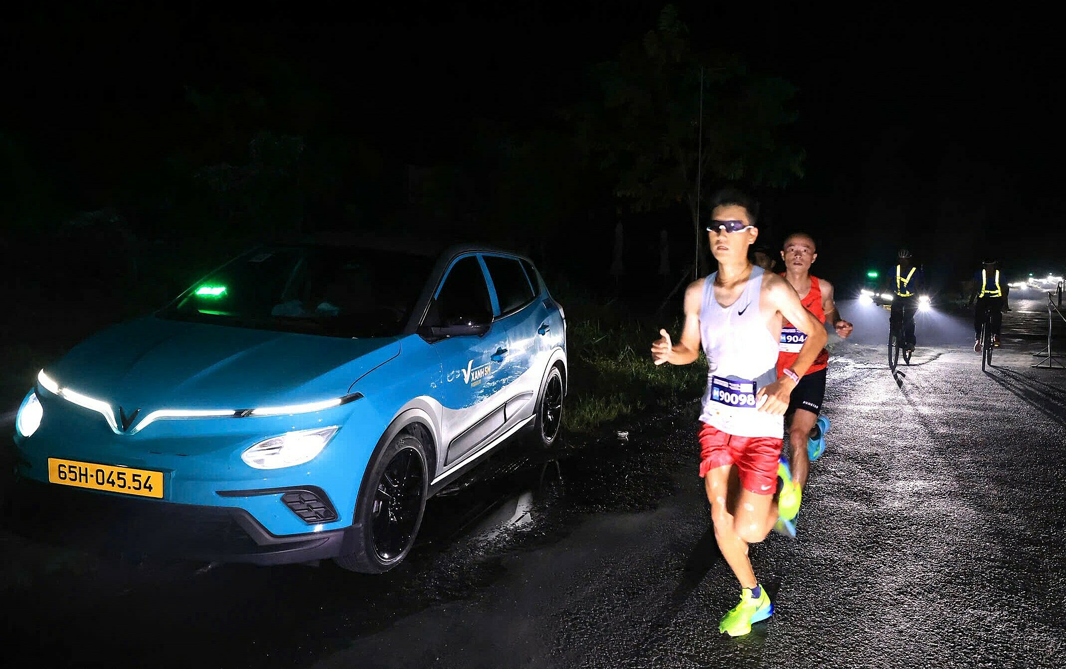 Around 4 a.m., as the first 42km runners approached a dimly lit area around the 30km mark, dozens of Xanh SM electric vehicles illuminated the path. This particular stretch lacked overhead lighting, making the electric vehicles a crucial safety measure for the runners.