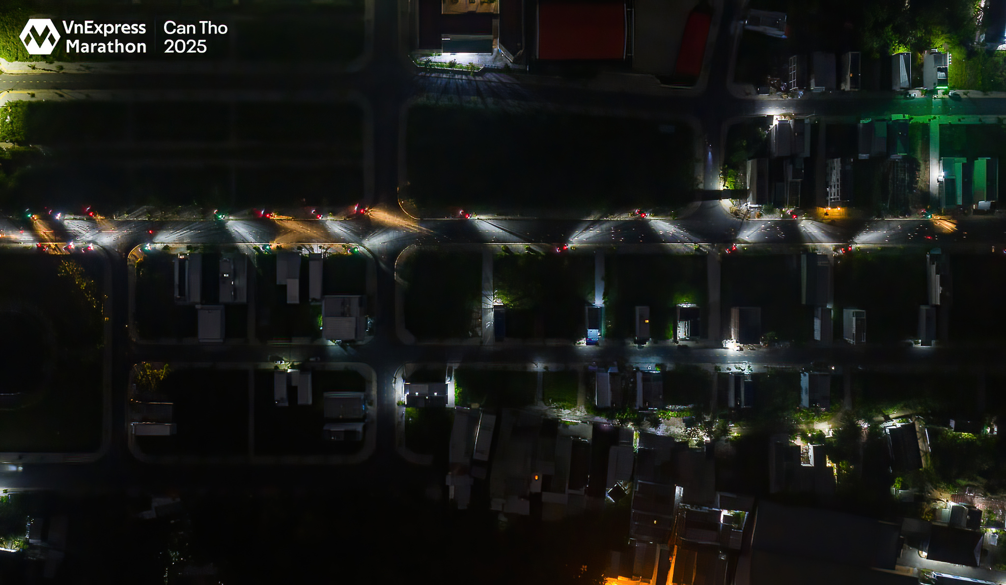 From above, the beams from the Xanh SM vehicles created a bright streak along the course. This eco-friendly solution, using zero-emission electric vehicles, didn't disrupt the runners' experience.