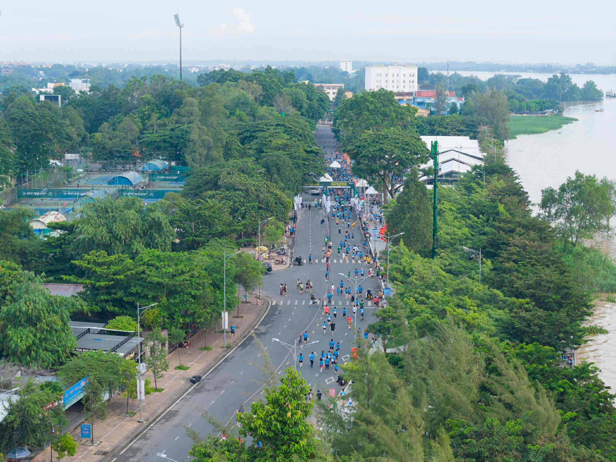 Thousands of runners gathered at Song Hau park, the start and finish line of the race. The spacious and airy park provided an ideal setting for warm-ups and post-race relaxation. Photo: Huy Phong