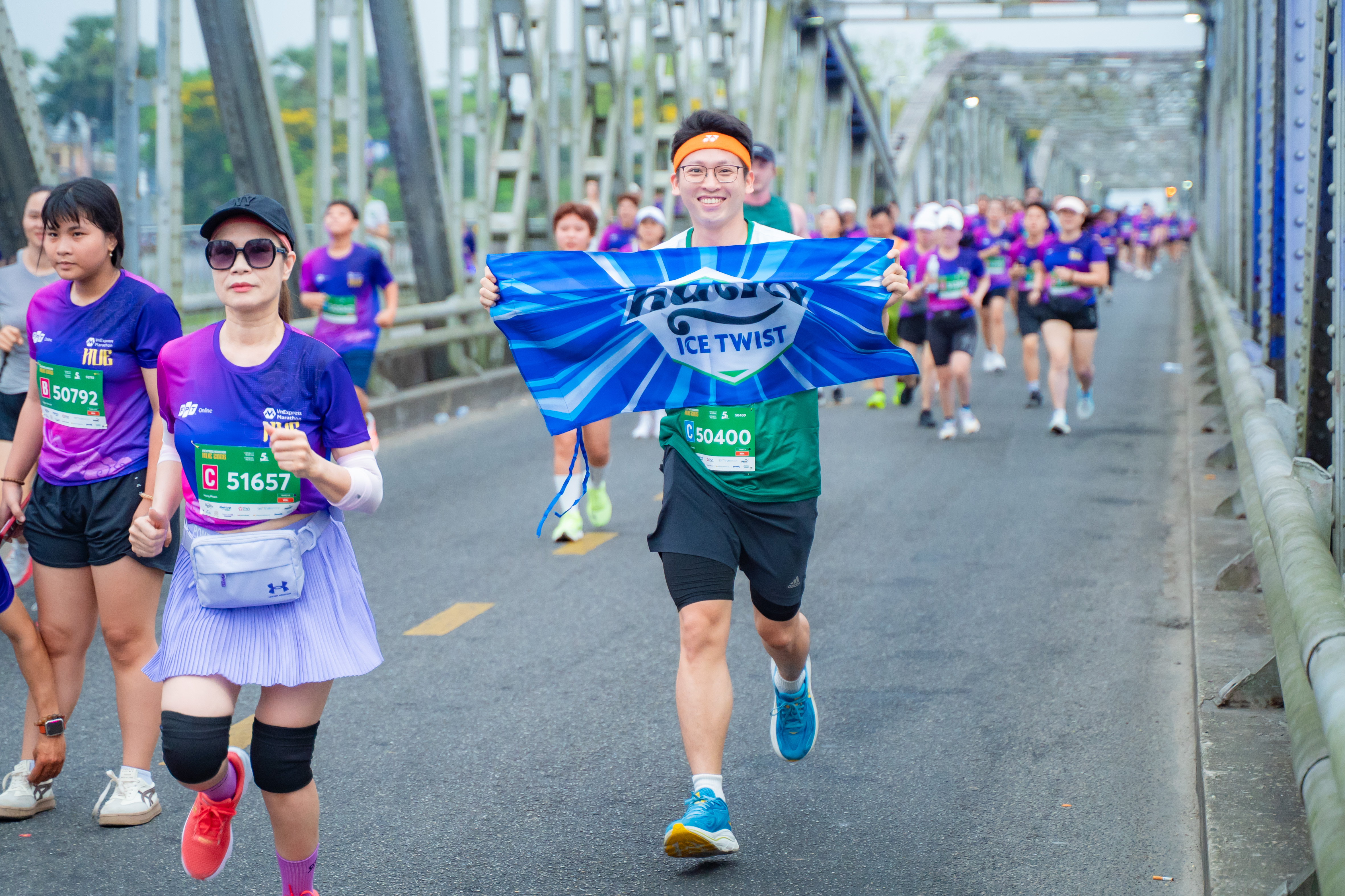 The company flag was raised by runners on Truong Tien Bridge, a historical symbol of the ancient capital. |
