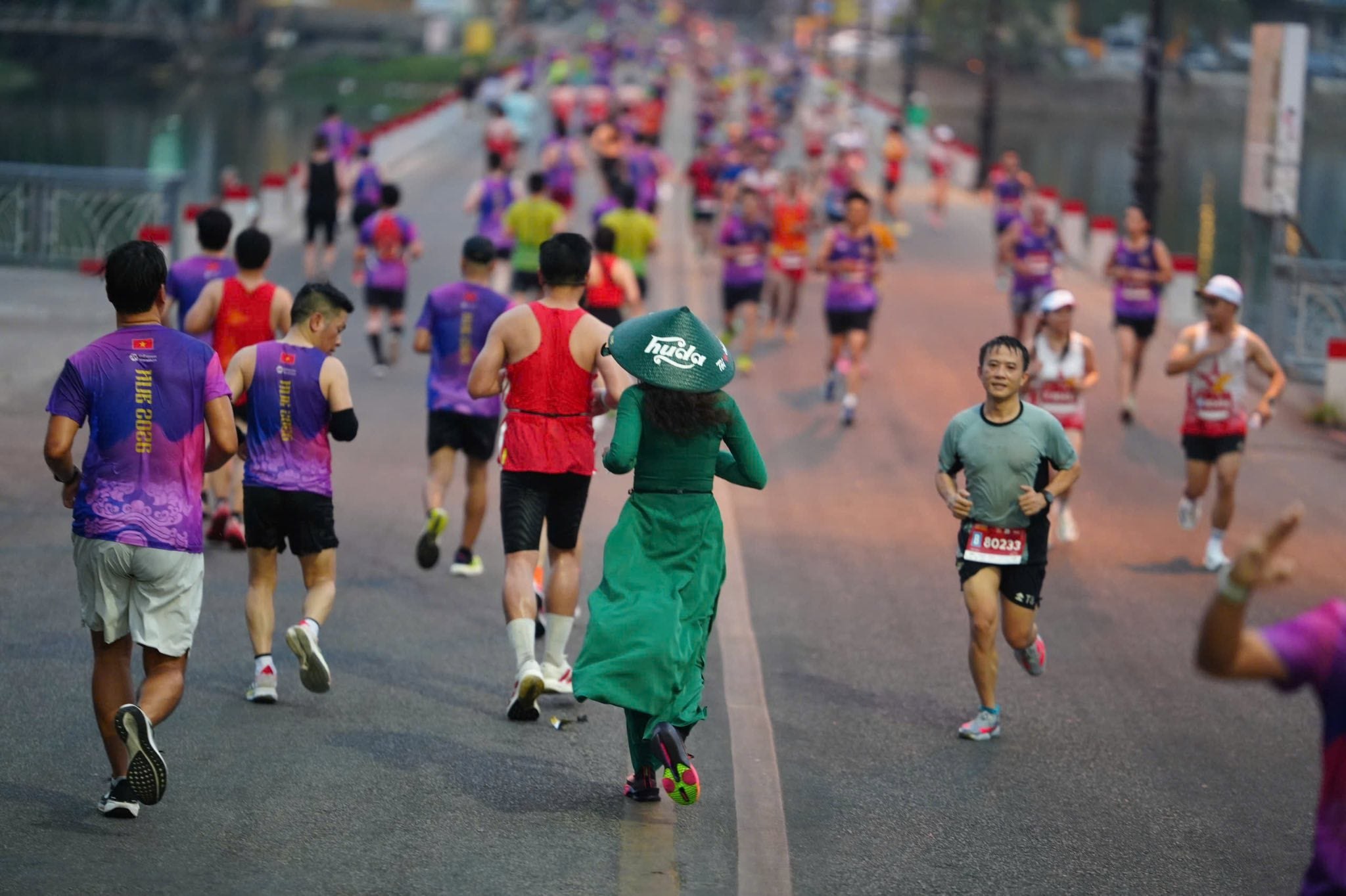 Runners in blue ao dai and conical hats featuring the Huda logo stood out in the crowd as they ran over Dap Da Bridge. This area was exclusively for athletes participating in the 21km distance. |