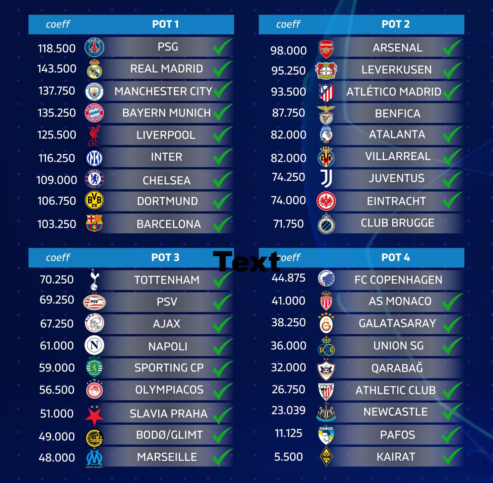 The other 29 teams had already qualified, including five from Spain (Real, Barca, Atletico, Bilbao, Villarreal), six from England (Liverpool, Man City, Arsenal, Chelsea, Tottenham, Newcastle), four from Germany (Bayern, Dortmund, Leverkusen, Frankfurt), four from Italy (Inter, Juventus, Napoli, Atalanta), and other prominent clubs such as PSG, Monaco, Marseille, Sporting, Ajax, PSV, and Galatasaray.